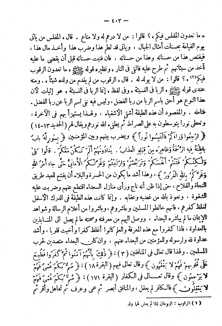 ونظيره قوله صلى الله عليه وسلم: "ما تعدون المفلس فيكم"؟ قالوا: من لا درهم له ولا متاع. قال: "المفلس من يأتى يوم القيامة بحسنات أمثال الجبال، ويأْتى قد لطم هذا وضرب هذا وأخذ مال هذا، فيقتص هذا من حسناته وهذا من حسناته، فإن فنيت حسناته قبل أن يقضى ما عليه أُخذ من سيئاتهم ثم طرح عليه فأُلقى فى النار"، ونظيره قوله صلى الله عليه وسلم: "ما تعدون الرقوب فيكم"؟ قالوا: من لا يولد له؟ قال: "الرقوب من لم يقدم من ولده شيئاً"، ومنه عندى قوله صلى الله عليه وسلم: "الربا فى النسيئة".