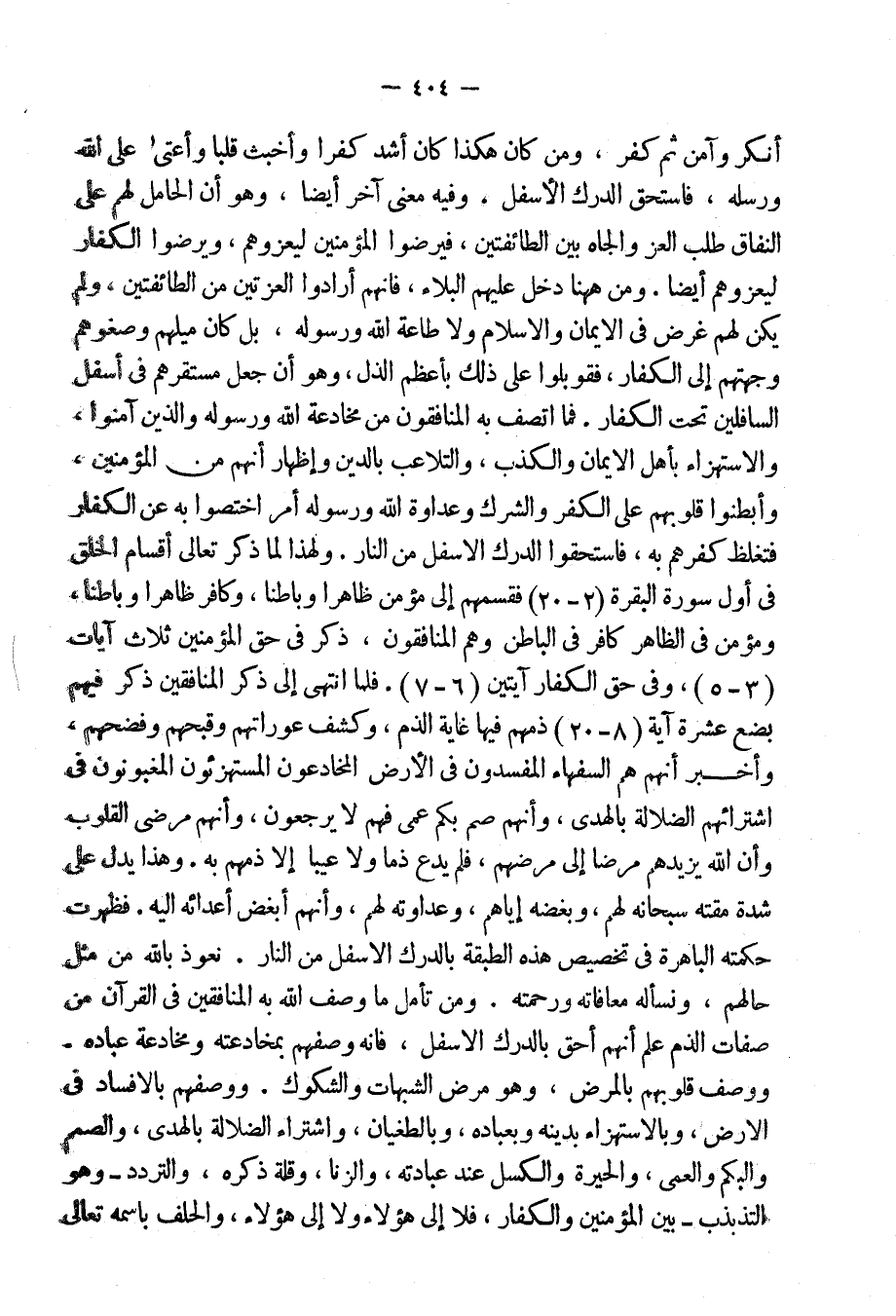 فلما انتهى إلى ذكر المنافقين ذكر فيهم بضع عشرة آية 8- 20 ذمهم فيها غاية الذم وكشف عوراتهم وقبحهم وفضحهم، وأخبر أنهم هم السفهاءُ المفسدون فى الأرض المخادعون المستهزئون المغبونون فى اشترائهم الضلالة بالهدى، وأنهم صم بكم عمى فهم لا يرجعون، وأنهم مرضى القلوب وأن الله يزيدهم مرضاً إلى مرضهم، فلم يدع ذماً ولا عيباً إلا ذمهم به، وهذا يدل على شدة مقته سبحانه لهم، وبغضه إياهم، وعداوته لهم، وأنهم أبغض أعدائه إليه. فظهرت حكمته الباهرة فى تخصص هذه الطبقة بالدرك الأسفل من النار.