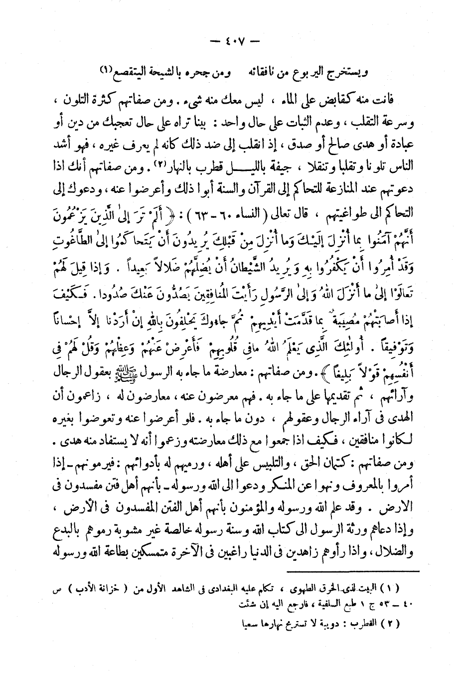 {أَلَمْ تَرَ إلَى الَّذِينَ يَزْعَمُونَ أَنَّهُمْ آمَنُوا بِمَا أُنزَلَ إِلَيْكَ وَمَا أُنزِلَ مِن قَبْلِكَ يُرِيدُونَ أَنْ يَتَحاكَمُوا إِلَى الطاغوت وَقَد أمرُوا أَن يَكْفُروا بهِ وَيُرِيدُ الشَّيْطَانُ أن يُضِلَّهُمْ ضَلالاً بَعِيداً وَإِذَا قِيلَ لَهُمْ تَعَالُوا إِلَى مَا أَنزَلَ اللهُ وإِلَى الرَّسُولِ رَأَيْتَ المُنَافقِين يَصُدُّونَ عَنكَ صُدُوداً فَكَيْف إِذَا أَصَابَتْهُمْ مُصِيبَةٌ بِمَا قَدَّمَتْ أَيْدِيَهِمْ ثُمَّ جَاؤُكَ يَحْلِفُونَ بِاللهِ إِنْ أَرَدْنَا إِلا إِحْسَاناً وَتَوْفِيقاً أُولَئِكَ الَّذِينَ يَعْلَمُ اللهُ مَا فِى قُلُوبِهِمْ فَأَعْرِضْ عَنْهُمْ وَعِظْهُمْ وَقُلْ لَهُم فِى أَنْفُسِهِمْ قَوْلاً بَلِيغاً} [النساء: 60-63] .