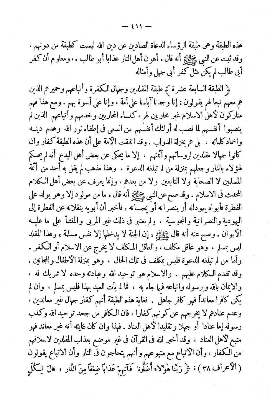 وقد اتفقت الأُمة على أن هذه الطبقة كفار وإن كانوا جهالاً مقلدين لرؤسائهم وأئمتهم إلا ما يحكى عن بعض أهل البدع أنه لم يحكم لهؤلاءِ بالنار وجعلهم بمنزلة من لم تبلغه الدعوة، وهذا مذهب لم يقل به أحد من أئمة المسلمين لا الصحابة ولا التابعين ولا من بعدهم، وإنما يعرف عن بعض أهل الكلام المحدث فى الإسلام.