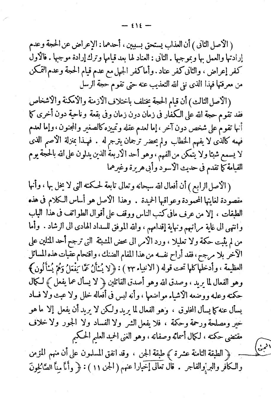 الأصل الثالث: أن قيام الحجة يختلف باختلاف الأزمنة والأمكنة والأشخاص فقد تقوم حجة الله على الكفار فى زمان دون زمان وفى بقعة وناحية دون أُخرى كما أنها تقوم على شخص دون آخر، إما لعدم عقله وتمييزه كالصغير والمجنون وإما لعدم فهمه كالذى لا يفهم الخطاب ولم يحضر ترجمان يترجم له. فهذا بمنزلة الأصم الذى لا يسمع شيئاً ولا يتمكن من الفهم، وهو أحد الأربعة الذين يدلون على الله بالحجة يوم القيامة كما تقدم فى حديث الأسود وأبى هريرة وغيرهما.
