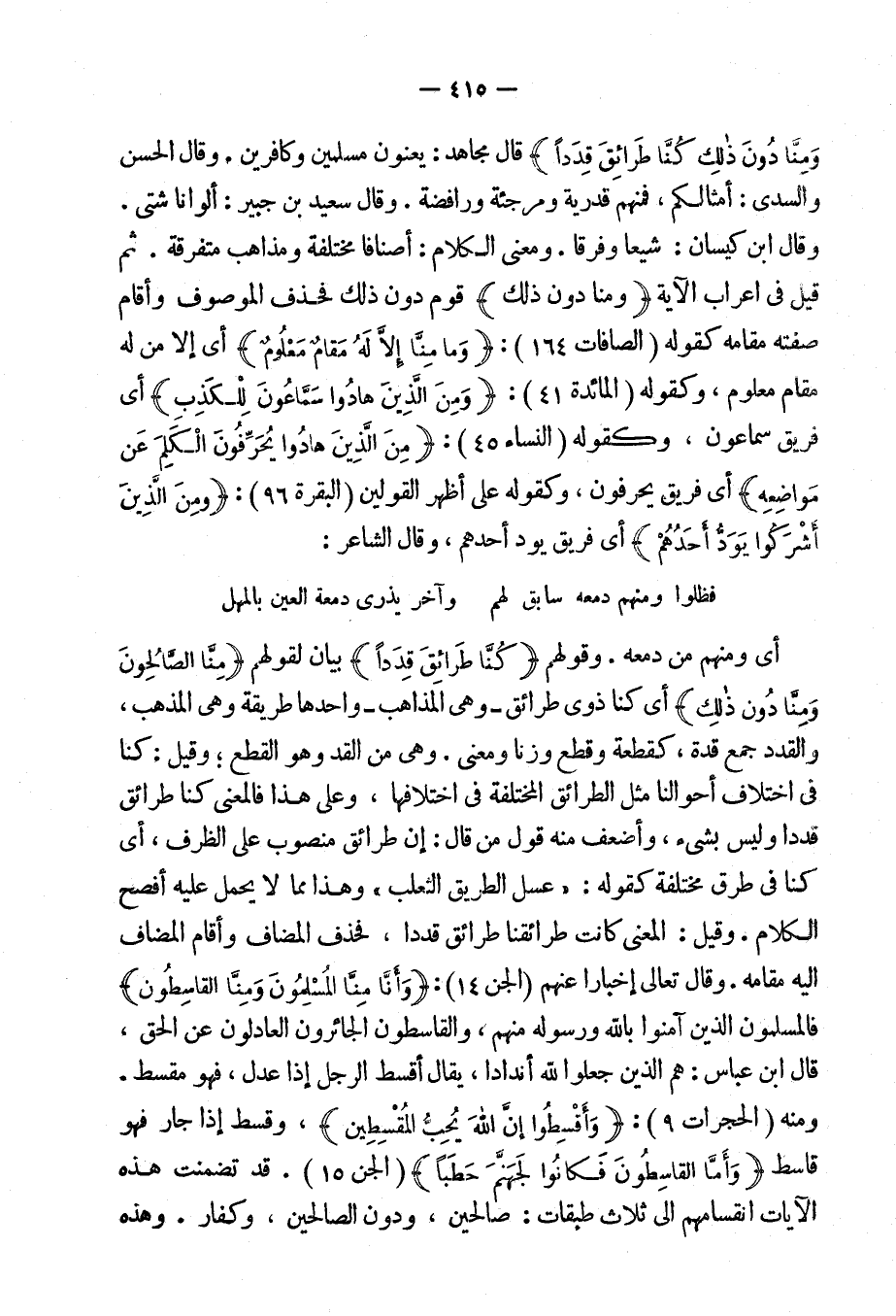 وقال الحسن والسدى: أمثالكم، فمنهم قدرية ومرجئة ورافضة. وقال سعيد ابن جبير: ألوانا شتى. وقال ابن كيسان: شيعاً وفرقاً. ومعنى الكلام: أصنافاً مختلفة ومذاهب متفرقة، ثم قيل فى إعراب الآية: {وَمِنَّا دُونَ ذَلِكَ} [أى ومنا] قوم دون ذلك، فحذف الموصوف وأقام صفته مقامه كقوله: {وَمَا مِنَّا إِلا لَهُ مَقَامٌ مَعْلُومٌ} [الصافات: 164] ، أى إلا من له مقام معلوم، وكقوله: {وَمِنَ الَّذِينَ هَادُوا سَمَّاعُونَ لِلْكَذِبِ} [المائدة: 41] ، أى فريق سماعون، وكقوله: {مِنَ الَّذِينَ هَادُوا يُحَرِّفُونَ الْكَلَمَ عَنْ مَوَاضِعِهِ} [النساء: 46] أى فريق يحرفون وكقوله على أظهر القولين: {وَمِنَ الَّذِينَ أَشْرَكُوا يَوَدُّ أَحَدُهُمْ} [البقرة: 96] أى فريق يود أحدهم، وقال الشاعر: