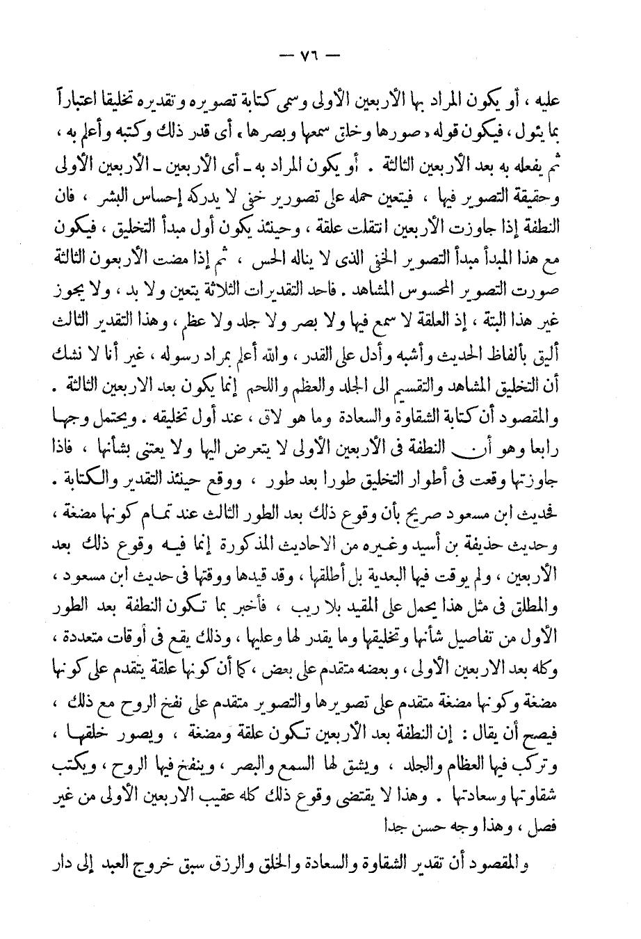 بأول أحوالها وما كانت عليه، أو يكون المراد بها الأربعين الأولى وسمى كتابة [تصويرها وتخليقها] وتقديره اعتباراً بما يئول، فيكون قوله: "صورها وخلق سمعها وبصرها" أى قدر ذلك وكتبه وأعلم به، ثم يفعله به بعد الأربعين الثالثة أو يكون المراد به- أى الأربعين- الأربعين الأولى وحقيقة التصوير فيها، فيتعين حمله على تصوير خفى لا يدركه إحساس البشر، فإن النطفة إذا جاوزت الأربعين انتقلت علقة، وحينذ يكون أول مبدإٍ التخليق فيكون مع هذا المبدإ مبدأُ التصوير الخفى الذى لا يناله الحس ثم إذا مضت الأربعون الثالثة صورت التصوير المحسوس المشاهد فأحد التقديرات الثلاثة يتعين ولا بد، ولا يجوز غير هذا البتة، إذ العلقة لا سمع فيها ولا بصر ولا جلد ولا عظم، وهذا التقدير الثالث أليق بألفاظ الحديث وأشبه وأدل على القدر، والله أعلم بمراد رسوله، غير أنا لا نشك أن التخليق المشاهد والتقسيم إلى الجلد والعظم واللحم إنما يكون بعد الأربعين الثالثة والمقصود أن كتابة الشقاوة والسعادة وما هو لاق، [كان] عند أول تخليقه. ويحتمل وجهاً رابعاً وهو أن النطفة فى الأربعين الأولى لا يتعرض إليها ولا يعتنى بشأْنها، فإذا جاوزتها وقعت فى أطوار التخليق طوراً بعد طور، ووقع حينئذ التقدير والكتابة. فحديث ابن مسعود صريح بأن وقوع ذلك بعد الطور الثالث عند تمام كونها مضغة، وحديث حذيفة بن أُسيد وغيره من الأحاديث المذكورة إنما فيه وقوع ذلك بعد الأربعين، ولم يوقت فيها البعدية بل أطلقها، وقد قيدها ووقتها فى حديث ابن مسعود، والمطلق فى مثل هذا يحمل على المقيد بلا ريب، فأخبر بما تكون النطفة بعد الطور الأول من تفاصيل شأنها وتخليقها وما يقدر لها وعليها، وذلك يقع فى أوقات متعددة، وكله بعد الأربعين الأُولى، وبعضه متقدم على بعض، كما أن كونها علقة يتقدم على كونها مضغة وكونها مضغة متقدم على تصويرها والتصوير متقدم على نفخ الروح مع ذلك، فيصح أن يقال: إن النطفة بعد الأَربعين تكون علقة ومضغة، ويصور خلقها، وتركب فيها العظام والجلد، ويشق لها السمع والبصر، وينفخ فيها الروح ويكتب شقاوتها وسعادتها. وهذا لا يقتضى وقوع ذلك كله عقيب الأربعين الأولى من غير فصل. وهذا وجه حسن جداً.
