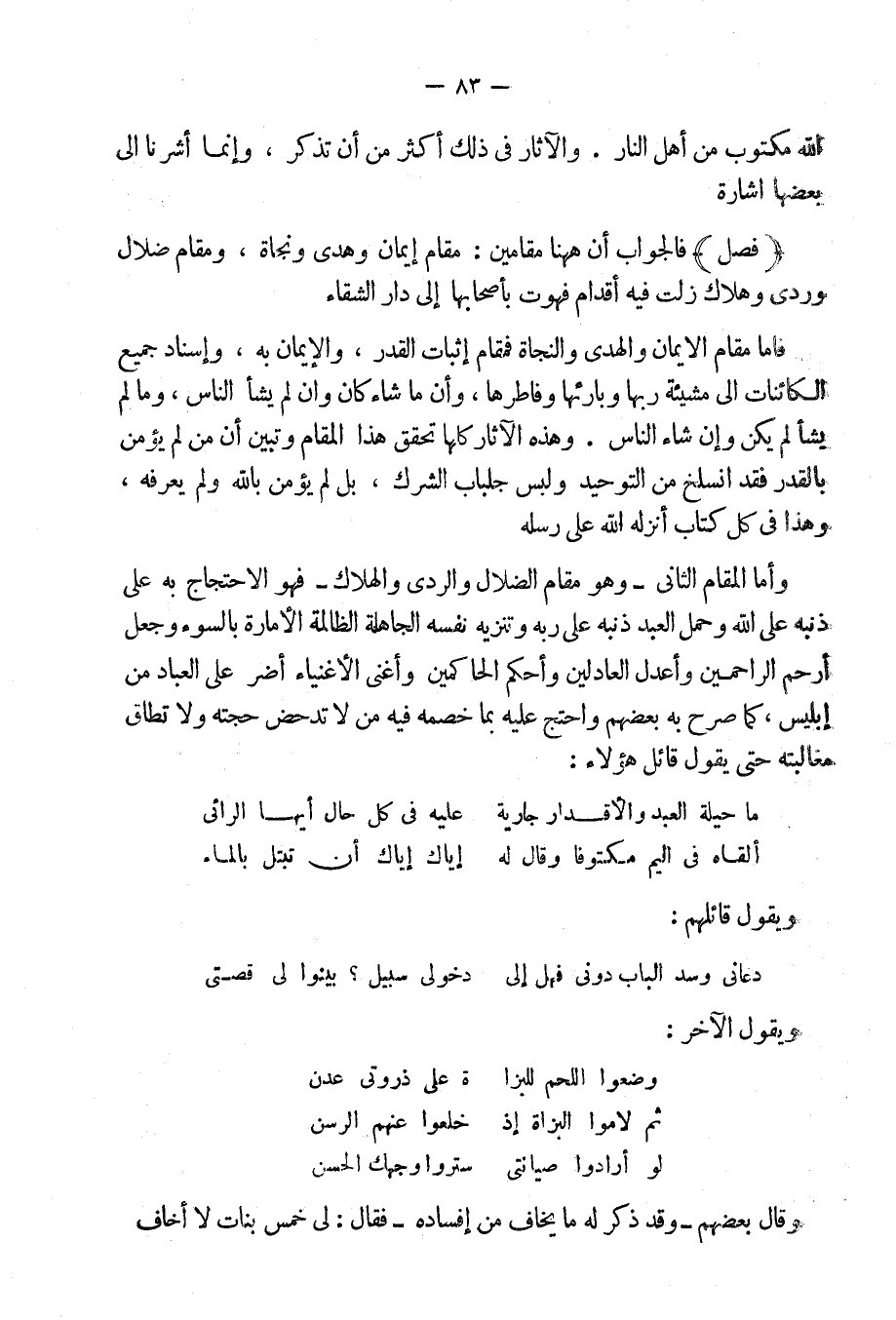 فأما مقام الإيمان والهدى والنجاة فمقام إثبات القدر والإيمان به، وإسناد جميع الكائنات إلى مشيئة ربها وبارئها وفاطرها، وأن ماشاء كان وإن لم يشأ الناس، وما لم يشأ لم يكن وإن شاء الناس، وهذه الأثاركلها تحقق هذا المقام وتبين أن من لم يؤمن بالقدر فقد أنسلخ من التوحيد ولبس جلباب الشرك، بل لم يؤمن بالله ولم يعرفه، وهذا فى كل كتاب انزله الله على رسله