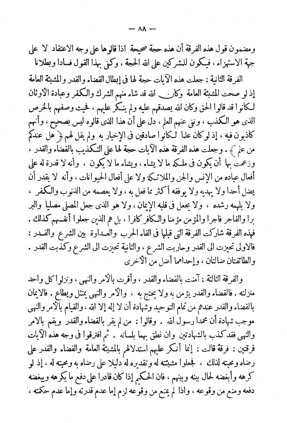 والفرقة الثالثة: آمنت بالقضاء والقدر، وأقرت بالأمر والنهى، ونزلوا كل واحد منزلته. فالقضاءُ والقدر يؤمن به ولا يحتج به، والأمر والنهى يمتثل ويطاع. فالإيمان بالقضاء والقدر عندهم من تمام التوحيد وشهادة أن لا إلَه إلا الله، والقيام بالأمر والنهى موجب شهادة أن محمداً رسول الله. وقالوا: من لم يقر بالقضاء والقدر ويقوم بالأمر والنهى فقد كذب بالشهادتين وإن نطق بهما بلسانه. ثم افترقوا فى وجه هذه الآيات فرقتين: فرقة قالت: إنما أنكر عليهم استدلالهم بالمشيئة العامة والقضاء والقدر على رضاه ومحبته لذلك، فجعلوا مشيئته له وتقديره له دليلاً على رضاه به ومحبته له، إذ لو كرهه وأبغضه لحال بينهم وبينه، فإن الحكيم إذا كان قادراً على دفع ما يكرهه ويبغضه دفعه ومنع من وقوعه وإذا لم يمنع من وقوعه لزم إماعدم