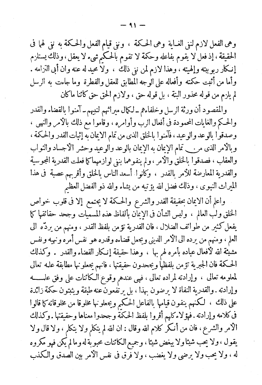 والمقصود أن ورثة الرسل وخلفاءَهم- لكمال ميراثهم لنبيهم- آمنوا بالقضاء والقدر والحكم والغايات المحمودة فى أفعال الرب وأوامره، وقاموا مع ذلك بالأمر والنهى، وصدقوا بالوعد والوعيد، فآمنوا بالخلق الذى من تمام الإيمان به إثبات القدر والحكمة، وبالأمر الذى من تمام الإيمان به الإيمان بالوعد والوعيد وحشر الأجساد والثواب والعقاب، فصدقوا بالخلق والأمر، ولم ينفوهما بنفى لوازمهما كما فعلت القدرية المجوسية والقدرية المعارضة للأمر بالقدر، وكانوا أسعد الناس بالخلق وأقربهم عصبة فى هذا الميراث النبوى، وذلك فضل الله يؤتيه من يشاء والله ذو الفضل العظيم.