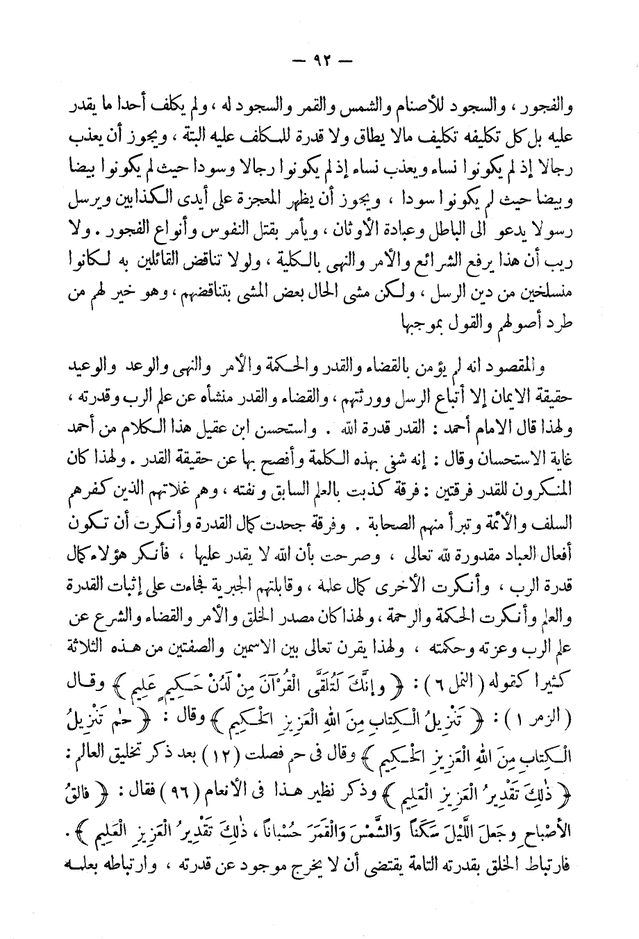 المنكرون للقدر فرقتين: فرقة كذبت بالعلم السابق ونفته، وهم غلاتهم الذين كفرهم السلف والأئمة وتبرأ منهم الصحابة. وفرقة جحدت كمال القدرة وأنكرت أن تكون أفعال العباد مقدورة لله تعالى وصرحت بأن الله لا يقدر عليها، فأنكر هؤلاء كمال قدرة الرب، وأنكرت الأخرى كمال علمه، وقابلتهم الجبرية فجاءت على إثبات [القدرة] والعلم وأنكرت الحكمة والرحمة، ولهذا كان مصدر الخلق والأمر والقضاءِ والشرع عن علم الرب وعزته وحكمته، ولهذا يقرن تعالى بين الاسمين [والصفتين] من هذه الثلاثة كثيراً كقوله: {وَإِنَّكَ لَتُلَقَّى الْقُرْآنَ مِنَ لَدُنْ حَكِيمٍ عَلِيمٍ} [النمل:6] ، وقال: {تَنْزِيلُ الْكِتَابِ مِن الله الْعَزِيز} [الحكيم] [الزمر: 1] ، وقال: {حم تَنْزِيلُ الْكِتَابِ مِنَ الله الْعَزِيزِ العَلٍيمِ} [غافر: 1-2] وقال: فى حم فصلت بعد ذكر تخليق العالم: {ذَلِكَ تَقْدِيرُ الْعَزِيزِ الْعَلِيمِ} [فصلت: 12]