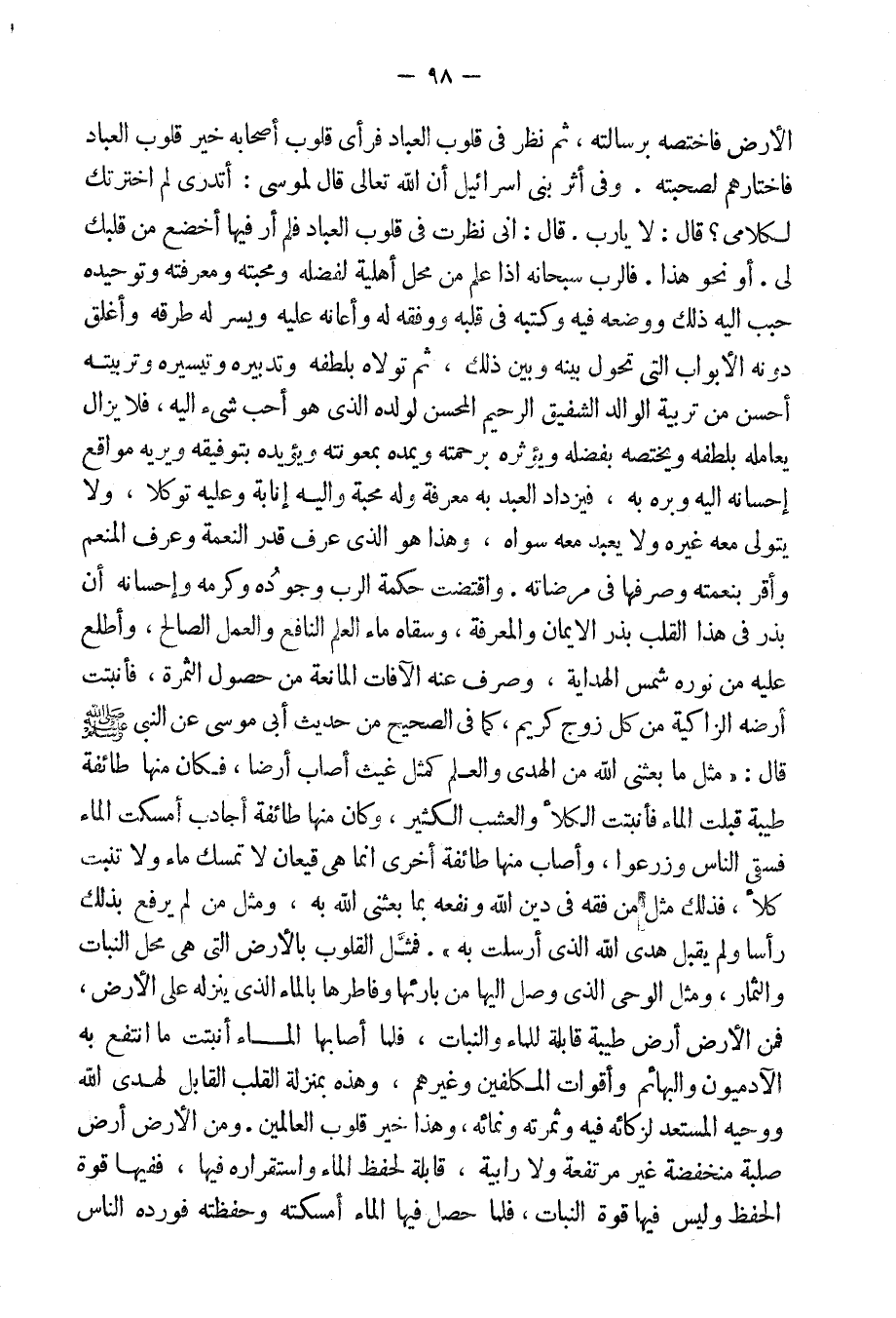 فالرب سبحانه إذا علم من محل أهلية لفضله ومحبته ومعرفته وتوحيده حبب إليك ذلك ووضعه فيه وكتبه فى قلبه ووفقه له وأعانه عليه ويسر له طرقه وأغلق دونه الأبواب التى تحول بينه وبين ذلك، ثم تولاه بلطفه وتدبيره وتيسيره وتربيته أعظم من تربية الوالد الشفيق الرحيم المحسن لولده الذى هو أحب شئ إليه، فلا يزال يعامله بلطفه ويختصه بفضله ويؤثره برحمته ويمده بمعونته ويؤيده بتوفيقه ويريه مواقع إحسانه إليه وبره به، فيزداد العبد به معرفة وله محبته وإليه إنابة وعليه توكلاً، ولا يتولى معه غيره ولا يعبد معه سواه، وهذا هو الذى عرف قدر النعمة وعرف المنعم وأقر بنعمته وصرفها فى مرضاته. واقتضت حكمة الرب [تعالى] وجودُه وكرمه وإحسانه أن بذر فى هذا القلب بذر الإيمان والمعرفة. وسقاه ماء العلم النافع والعمل الصالح، وأطلع عليه من نوره شمس الهداية، وصرف عنه الآفات المانعة من حصول الثمرة، فأنبتت أرضه الزاكية من كل زوج كريم، كما فى الصحيح من حديث أبى موسى عن النبى صلى الله عليه وسلم قال: "مَثَلُ مَا بَعَثَنِى اللهُ مِنَ الْهُدَى وَالْعِلْمِ كَمَثَلِ غَيْثٍ أَصَابَ أَرْضاً، فَكَانَ منها طَائِفَة طَيَّبَة قَبِلَت الْمَاء فَأنْبَتَتْ الْكلأَ وَالْعُشْبَ الْكَثِيرَ، وَكَانَ مِنْهَا طَائِفَةٌ أَجَادِبُ أَمْسَكَت الماءِ فَسُقِى النَّاسُ وَزَرَعُوا، وَأَصَابَ مِنْهَا طَائِفَةً أُخْرَى إِنَّمَا هِى قِيعَانٌ لا تَمْسِكَ مَاءً وَلا تُنْبِتُ كَلأَ، فَذَلِكَ مَثَلُ مَنْ فَقِهَ فِى دِينِ الله وَنَفَعَهُ بِمَا بَعَثَنِى اللهُ بِهِ، وَمَثَلُ مَنْ لَمْ يَرْفَعْ بِذَلِكَ رَأْسَاً وَلَمْ يَقْبَل هُدَى اللهُ الَّذِى أُرْسِلْتُ بِهِ"