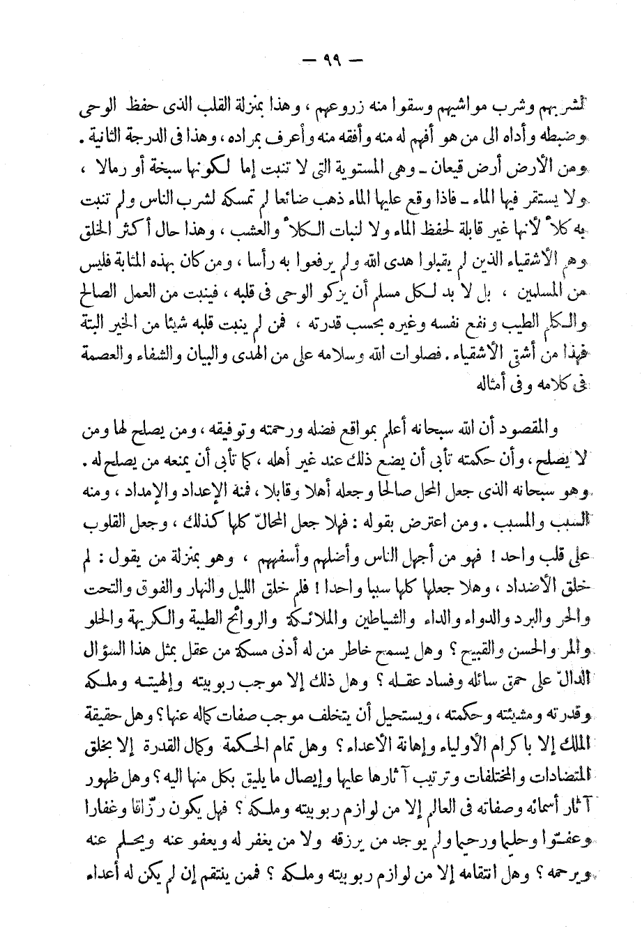 لشربهم وشرب مواشيهم وسقوا منه زروعهم، وهذا بمنزلة القلب الذى حفظ الوحى وضبطه وأَداه إلى من هو أفهم له منه وأَفقه منه وأَعرف بمراده، وهذا فى الدرجة الثانية. ومن الأرض أرض قيعان- وهى المستوية التى لا تنبت إما لكونها سبخة أو [رمالاً] ، ولا يستقر فيها الماء- فإذا وقع عليها الماءُ ذهب ضائعاً لم تمسكه لشرب الناس ولم تنبت به كلأَ لأنها غير قابلة لحفظ الماءِ ولا لنبات الكلإِ والعشب وهذا حال أَكثر الخلق وهم الأَشقياءُ الذين لم يقبلوا هدى الله ولم يرفعوا به رأْساً، ومن كان بهذه المثابة فليس من المسلمين، بل لا بد لكل مسلم أن يزكو الوحى فى قلبه فينبت من العمل الصالح والكلم الطيب ونفع نفسه وغيره بحسب قدرته، فمن لم ينبت قلبه شيئاً من الخير البتة فهذا من أشقى الأشقياءِ. فصلوات الله وسلامه على من الهدى والبيان والشفاءُ والعصمة فى كلامه وفى أمثاله.