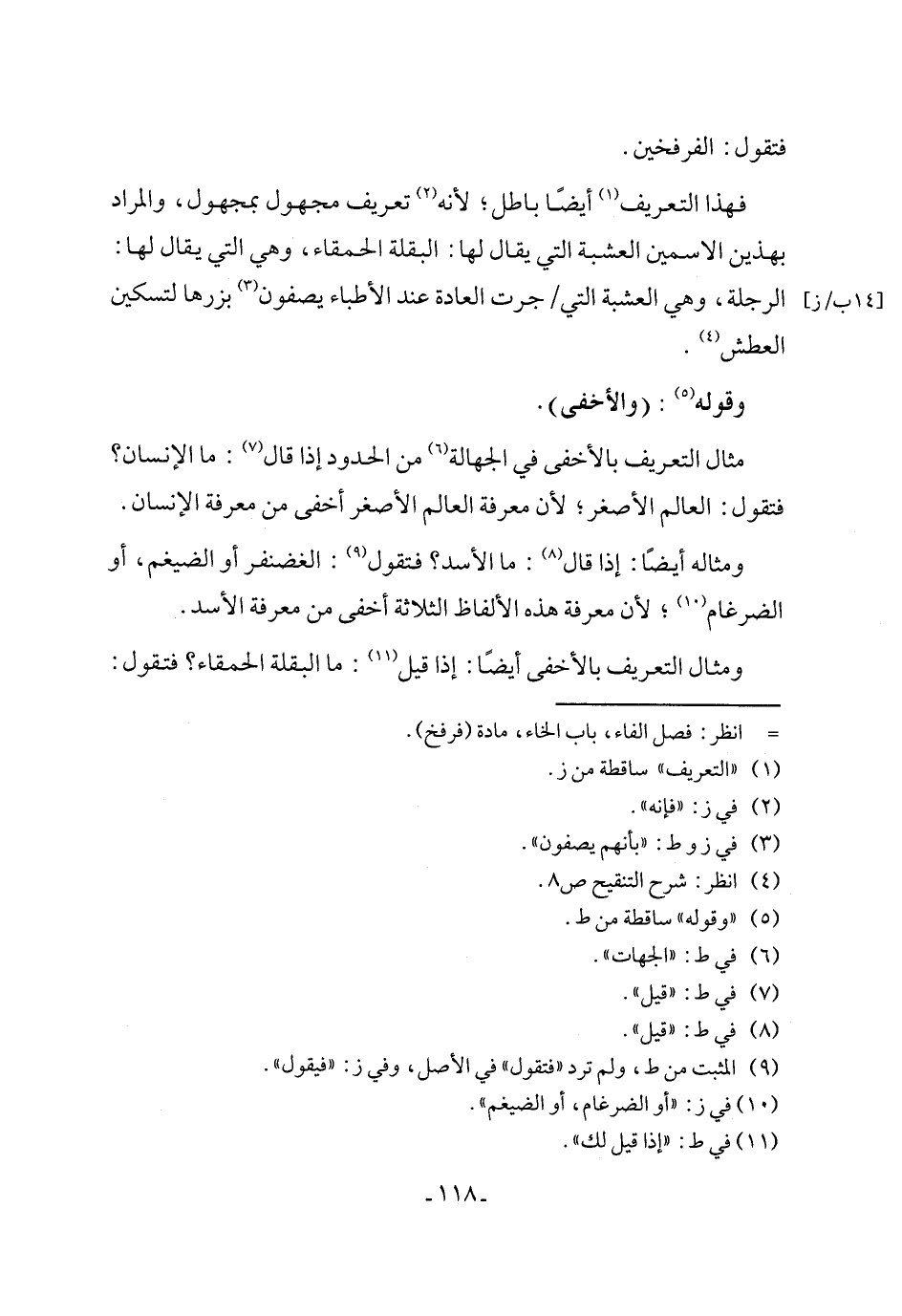 ومثال التعريف بالأخفى أيضًا: إذا قيل (¬11): ما البقلة الحمقاء؟ فتقول: