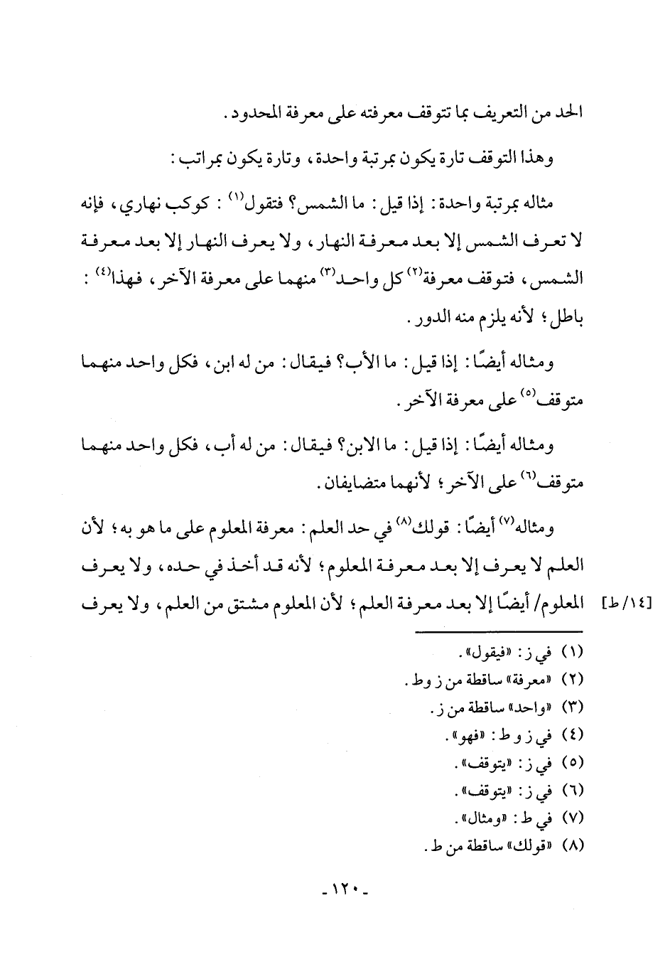 مثاله بمرتبة واحدة: إذا قيل: ما الشمس؟ فتقول (¬1): كوكب نهاري، فإنه لا تعرف الشمس إلا بعد معرفة النهار، ولا يعرف النهار إلا بعد معرفة الشمس، فتوقف معرفة (¬2) كل واحد (¬3) منهما على معرفة الآخر، فهذا (¬4): باطل؛ لأنه يلزم منه الدور.