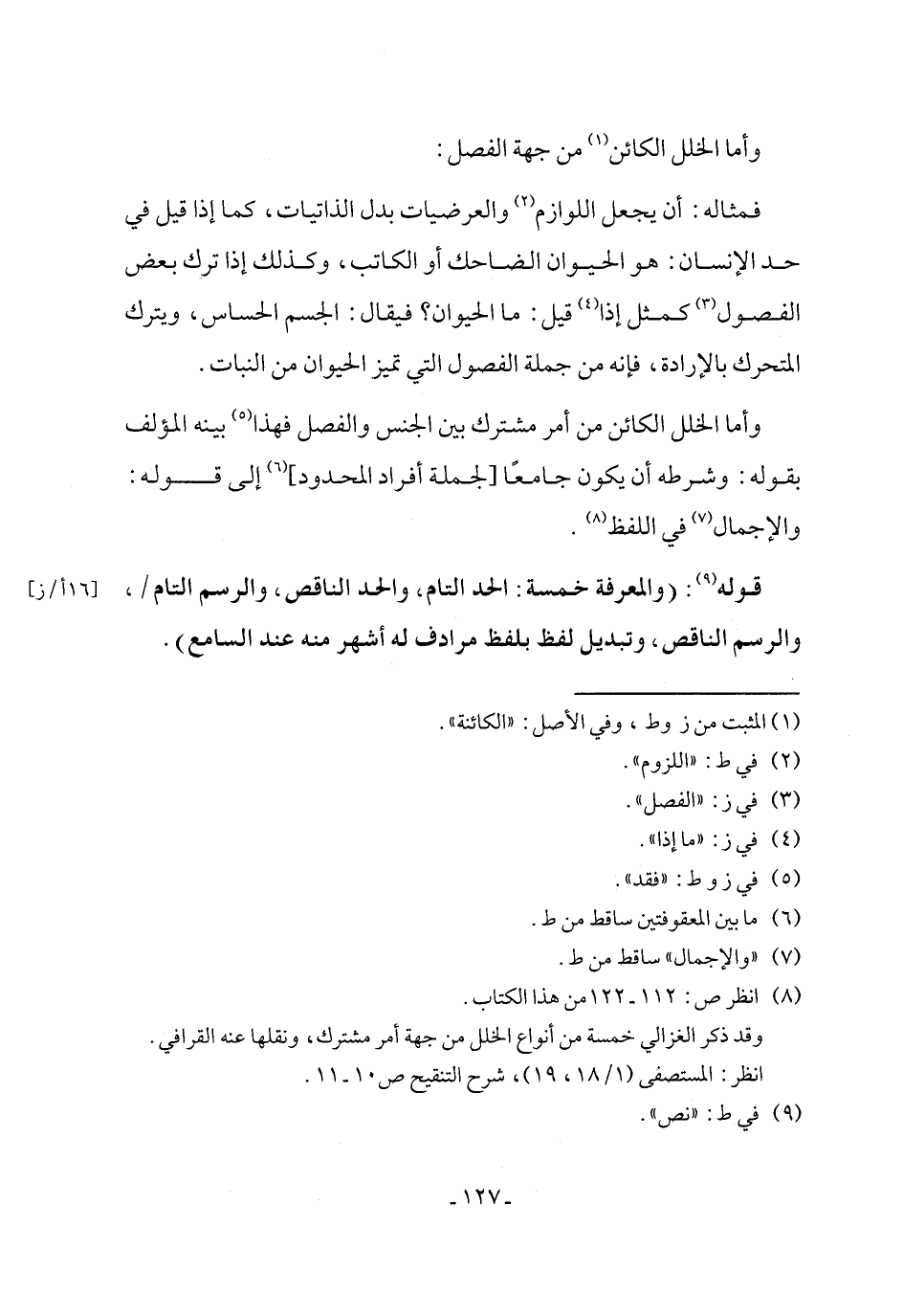فمثاله: أن يجعل اللوازم (¬2) والعرضيات بدل الذاتيات، كما إذا قيل في حد الإنسان: هو الحيوان الضاحك أو الكاتب، وكذلك إذا ترك بعض الفصول (¬3) كمثل إذا (¬4) قيل: ما الحيوان؟ فيقال: الجسم الحساس، ويترك المتحرك بالإرادة، فإنه من جملة الفصول التي تميز الحيوان من النبات.