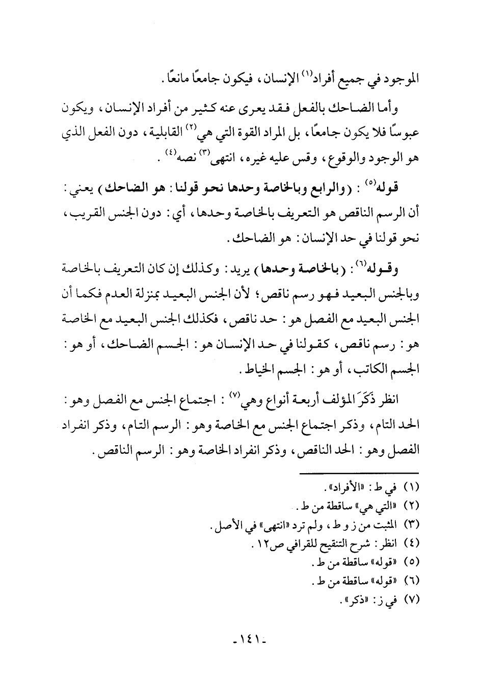 وأما الضاحك بالفعل فقد يعرى عنه كثير من أفراد الإنسان، ويكون عبوسًا فلا يكون جامعًا، بل المراد القوة التي هي (¬2) القابلية، دون الفعل الذي هو الوجود والوقوع، وقس عليه غيره، انتهى (¬3) نصه (¬4).