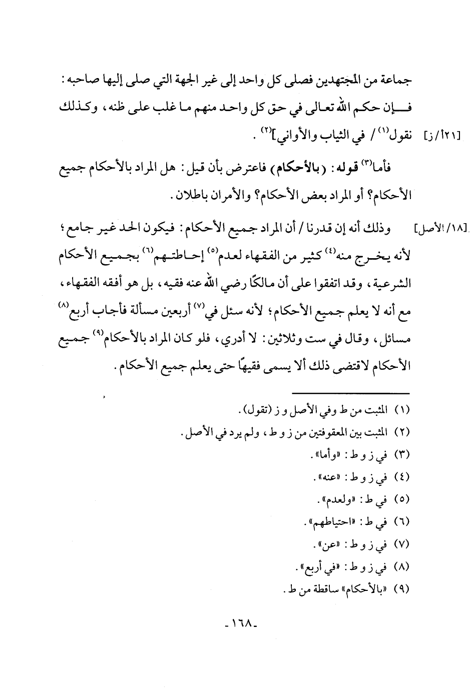 وذلك أنه إن قدرنا أن المراد جميع الأحكام: فيكون الحد غير جامع؛ لأنه يخرج منه (¬4) كثير من الفقهاء لعدم (¬5) إحاطتهم (¬6) بجميع الأحكام الشرعية، وقد اتفقوا على أن مالكًا رضي الله عنه فقيه، بل هو أفقه الفقهاء، مع أنه لا يعلم جميع الأحكام؛ لأنه سئل في (¬7) أربعين مسألة فأجاب أربع (¬8) مسائل، وقال في ست وثلاثين: لا أدري، فلو كان المراد بالأحكام (¬9) جميع الأحكام لاقتضى ذلك ألا يسمى فقيهًا حتى يعلم جميع الأحكام.