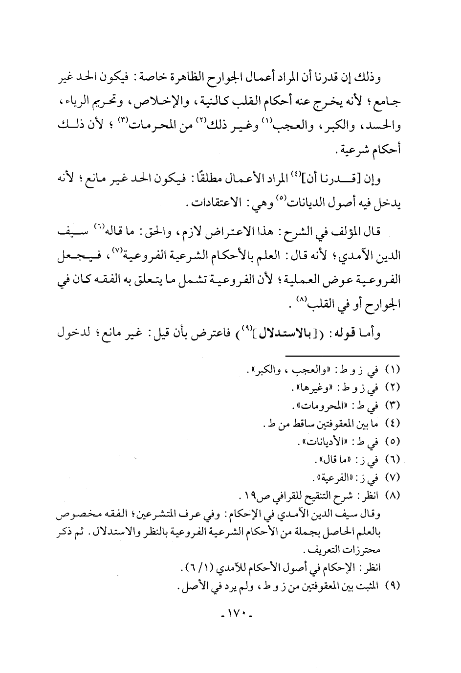 وذلك إن قدرنا أن المراد أعمال الجوارح الظاهرة خاصة: فيكون الحد غير جامع؛ لأنه يخرج عنه أحكام القلب كالنية، والإخلاص، وتحريم الرياء، والحسد، والكبر، والعجب (¬1) وغير ذلك (¬2) من المحرمات (¬3)؛ لأن ذلك أحكام شرعية.