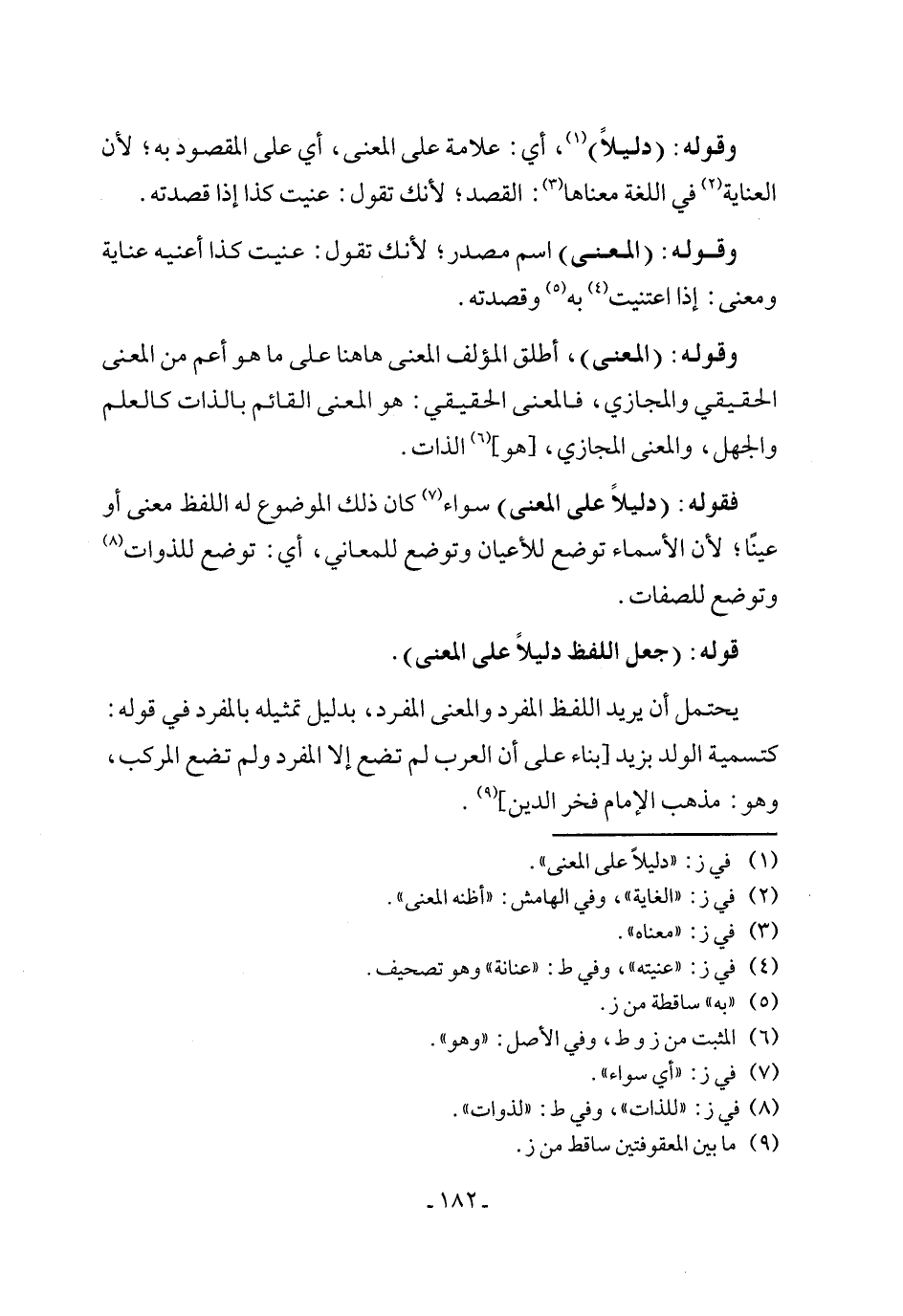 وقوله: (المعنى)، أطلق المؤلف المعنى ها هنا على ما هو أعم من المعنى الحقيقي والمجازي، فالمعنى الحقيقي: هو المعنى القائم بالذات كالعلم والجهل، والمعنى المجازي، [هو] (¬6) الذات.