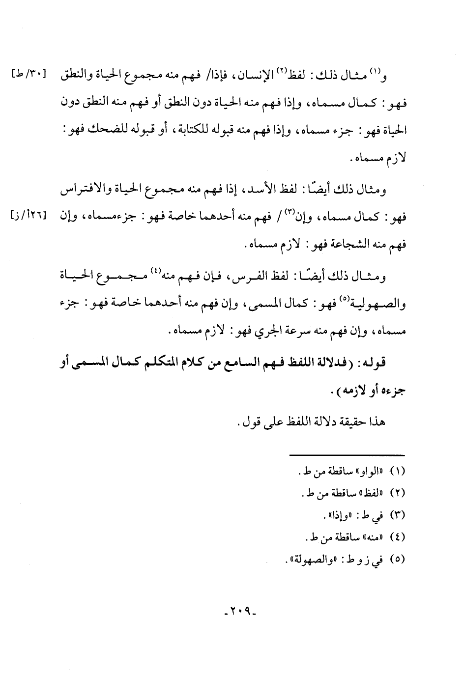 و (¬1) مثال ذلك: لفظ (¬2) الإنسان، فإذا فهم منه مجموع الحياة والنطق فهو: كمال مسماه، وإذا فهم منه الحياة دون النطق أو فهم منه النطق دون الحياة فهو: جزء مسماه، وإذا فهم منه قبوله للكتابة، أو قبوله للضحك فهو: لازم مسماه.
