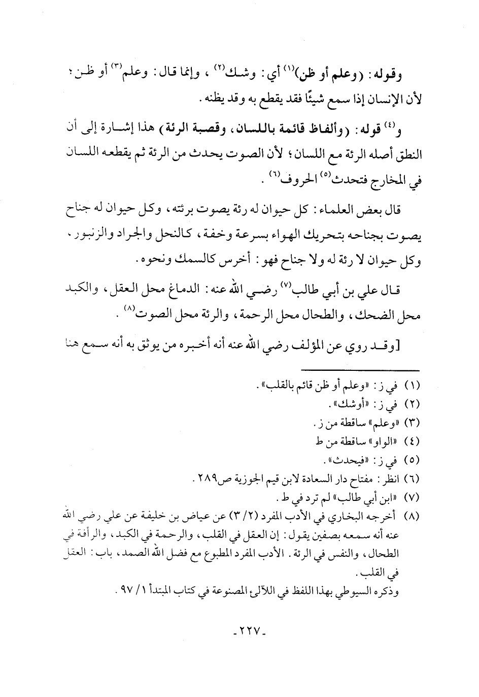 (¬8) أخرجه البخاري في الأدب المفرد (2/ 3) عن عياض بن خليفة عن علي رضي الله عنه أنه سمعه بصفين يقول: إن العقل في القلب، والرحمة في الكبد، والرأفة في الطحال، والنفس في الرئة. الأدب المفرد المطبوع مع فضل الله الصمد، باب: العقل في القلب.