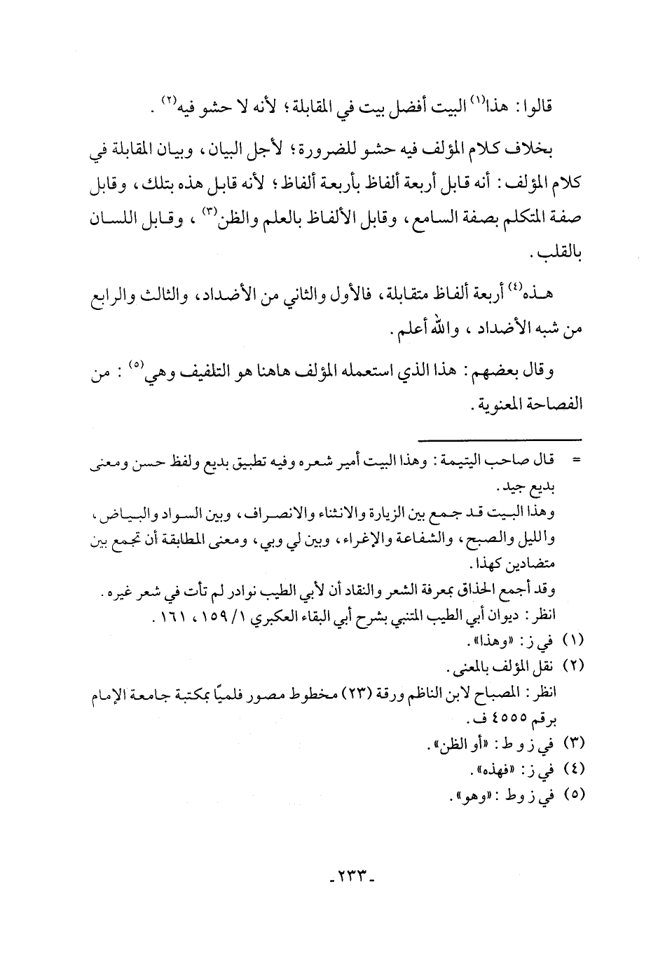 وقال بعضهم: هذا الذي استعمله المؤلف ها هنا هو التلفيف وهي (¬5): من الفصاحة المعنوية.