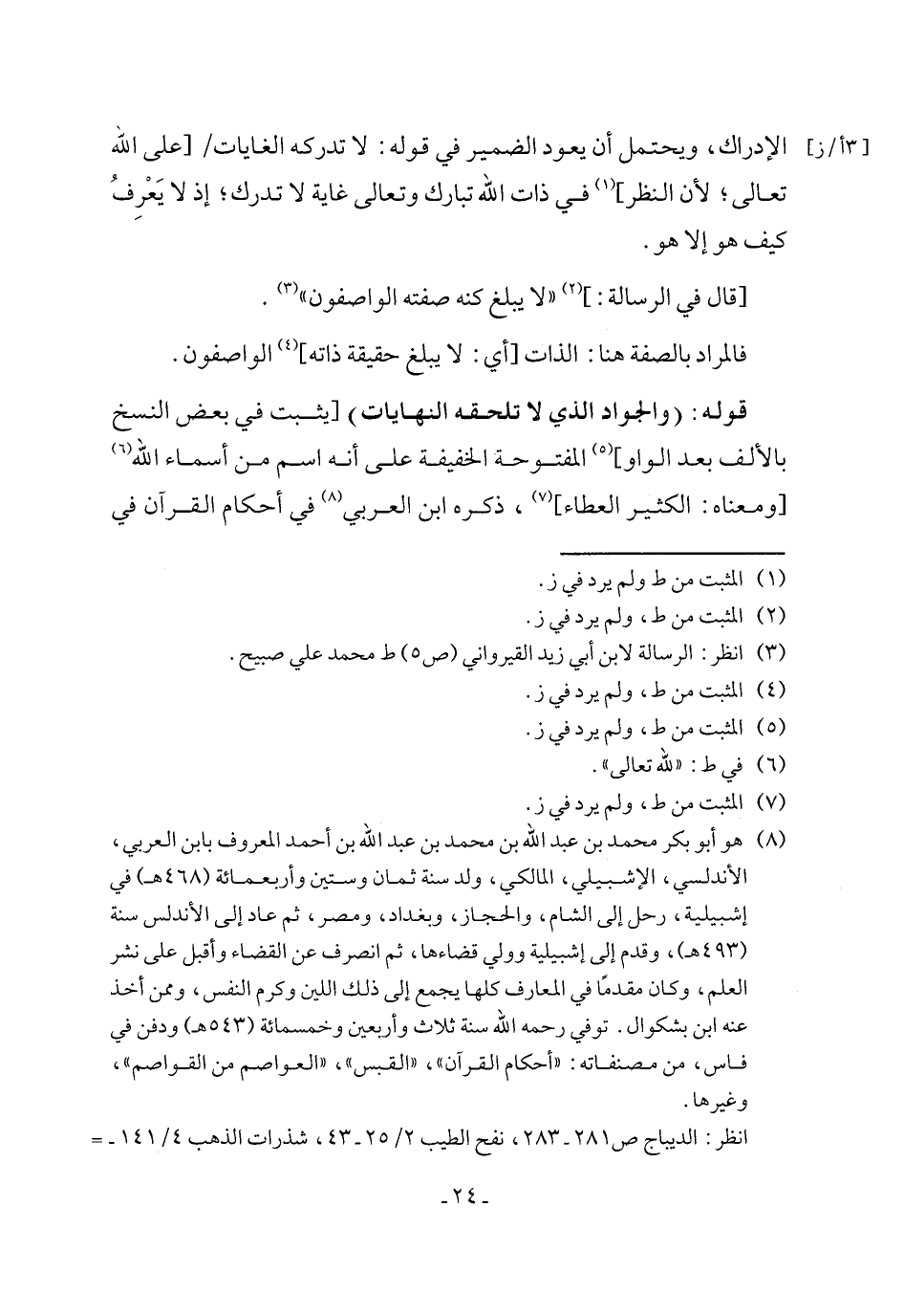 (¬8) هو أبو بكر محمد بن عبد الله بن محمد بن عبد الله بن أحمد المعروف بابن العربي، الأندلسي، الإشبيلي، المالكي، ولد سنة ثمان وستين وأربعمائة (468 هـ) في إشبيلية، رحل إلى الشام، والحجاز، وبغداد، ومصر، ثم عاد إلى الأندلس سنة (493 هـ)، وقدم إلى إشبيلية وولي قضاءه، ثم انصرف عن القضاء وأقبل على نشر العلم، وكان مقدمًا في المعارف كلها يجمع إلى ذلك اللين وكرم النفس، وممن أخذ عنه ابن بشكوال. توفي رحمه الله سنة ثلاث وأربعين وخمسمائة (543 هـ) ودفن في فاس، من مصنفاته: "أحكام القرآن"، "القبس"، "العواصم من القواصم"، وغيرها.