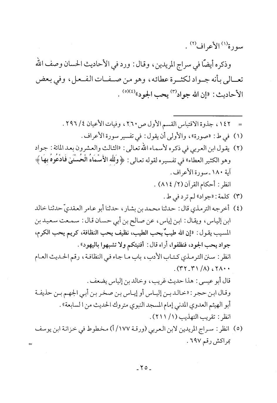 (¬2) يقول ابن العربي في ذكره لأسماء الله تعالى: "الثالث والعشرون بعد المائة: جواد وهو الكثير العطاء" في تفسيره لقوله تعالى: {وَلِلَّهِ الْأَسْمَاءُ الْحُسْنَى فَادْعُوهُ بِهَا} آية 180 - سورة الأعراف.