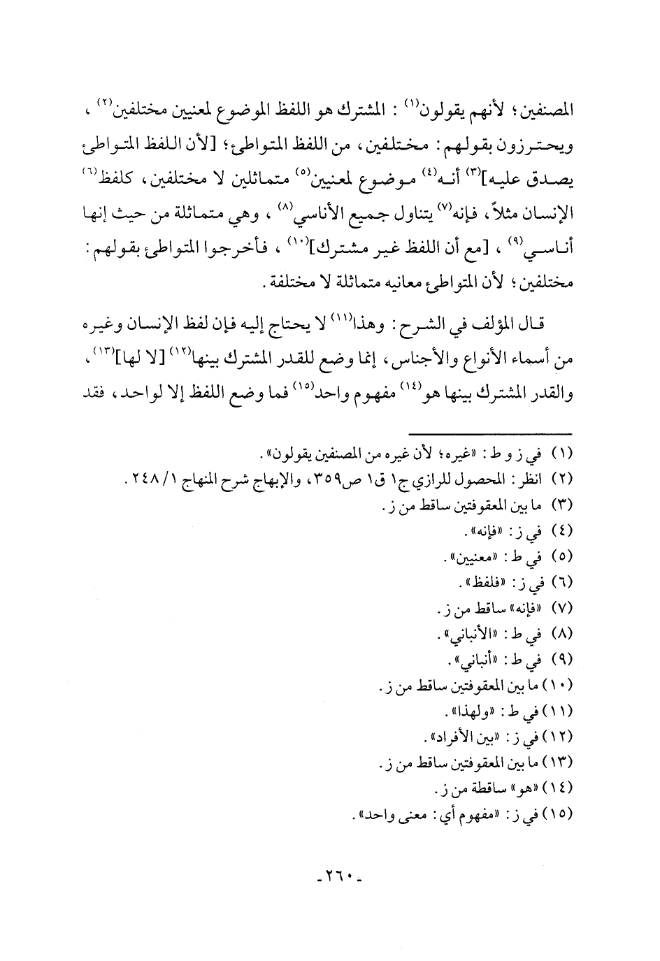 المصنفين؛ لأنهم يقولون (¬1): المشترك هو اللفظ الموضوع لمعنيين مختلفين (¬2)، ويحترزون بقولهم: مختلفين، من اللفظ المتواطئ؛ [لأن اللفظ المتواطئ يصدق عليه] (¬3) أنه (¬4) موضوع لمعنيين (¬5) متماثلين لا مختلفين، كلفظ (¬6) الإنسان مثلاً، فإنه (¬7) يتناول جميع الأناسي (¬8)، وهي متماثلة من حيث إنها أناسي (¬9)، [مع أن اللفظ غير مشترك] (¬10)، فأخرجوا المتواطئ بقولهم: مختلفين؛ لأن المتواطئ معانيه متماثلة لا مختلفة.