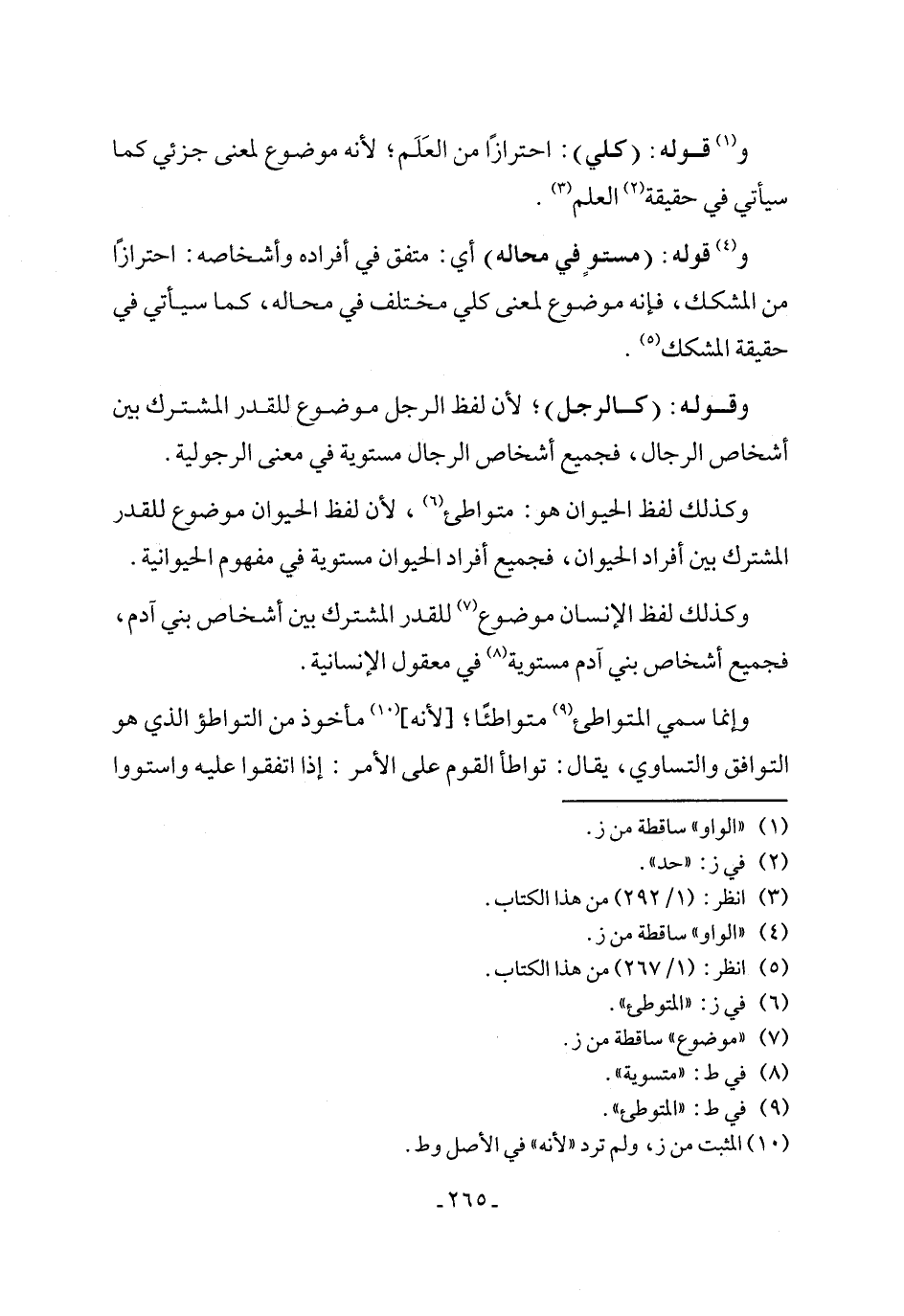 و (¬4) قوله: (مستوٍ في محاله) أي: متفق في أفراده وأشخاصه: احترازًا من المشكك، فإنه موضوع لمعنى كلي مختلف في محاله، كما سيأتي في حقيقة المشكك (¬5).