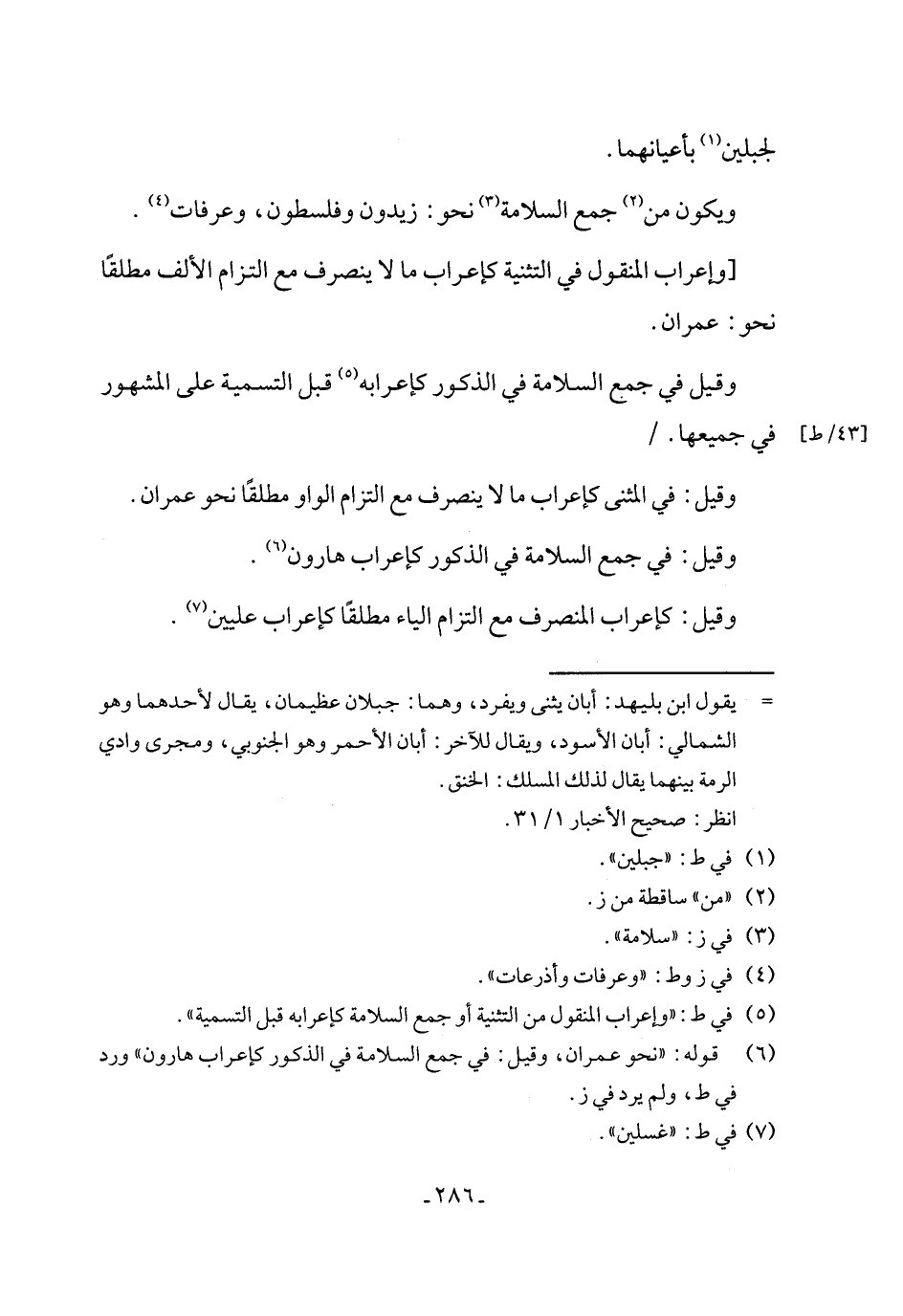 (¬6) قوله: "نحو عمران، وقيل: في جمع السلامة في الذكور كإعراب هارون" ورد في ط، ولم يرد في ز.