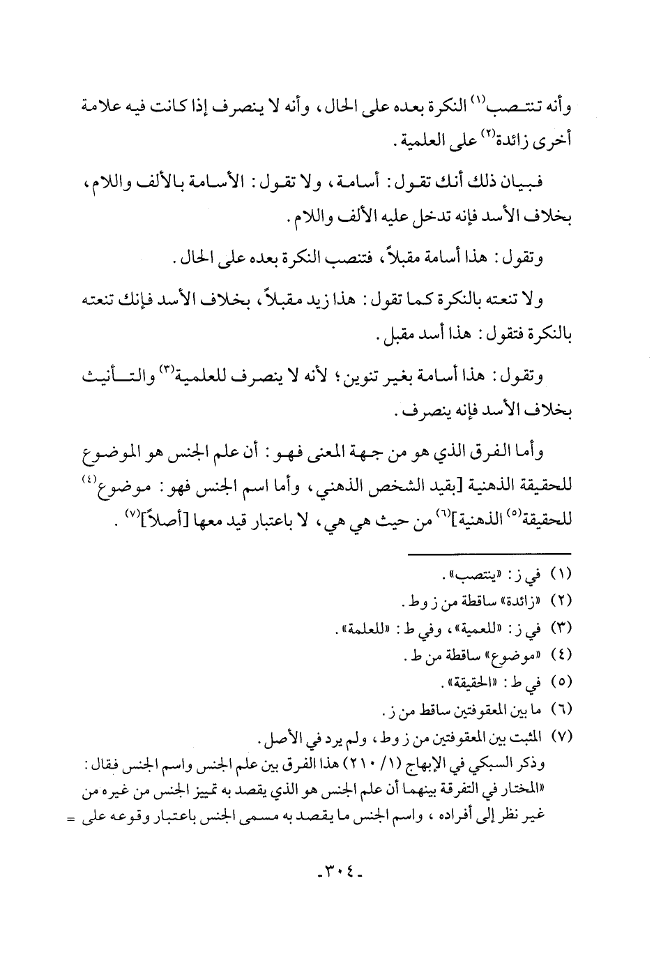 وتقول: هذا أسامة بغير تنوين؛ لأنه لا ينصرف للعلمية (¬3) والتأنيث بخلاف الأسد فإنه ينصرف.