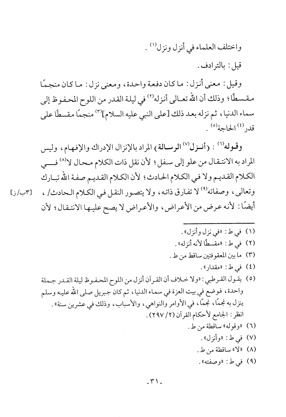 (¬5) يقول القرطبي: "ولا خلاف أن القرآن أنزل من اللوح المحفوظ ليلة القدر جملة واحدة، فوضع في بيت العزة في سماء الدنيا، ثم كان جبريل صلى الله عليه وسلم ينزل به نجمًا، نجمًا، في الأوامر والنواهي، والأسباب، وذلك في عشرين سنة".