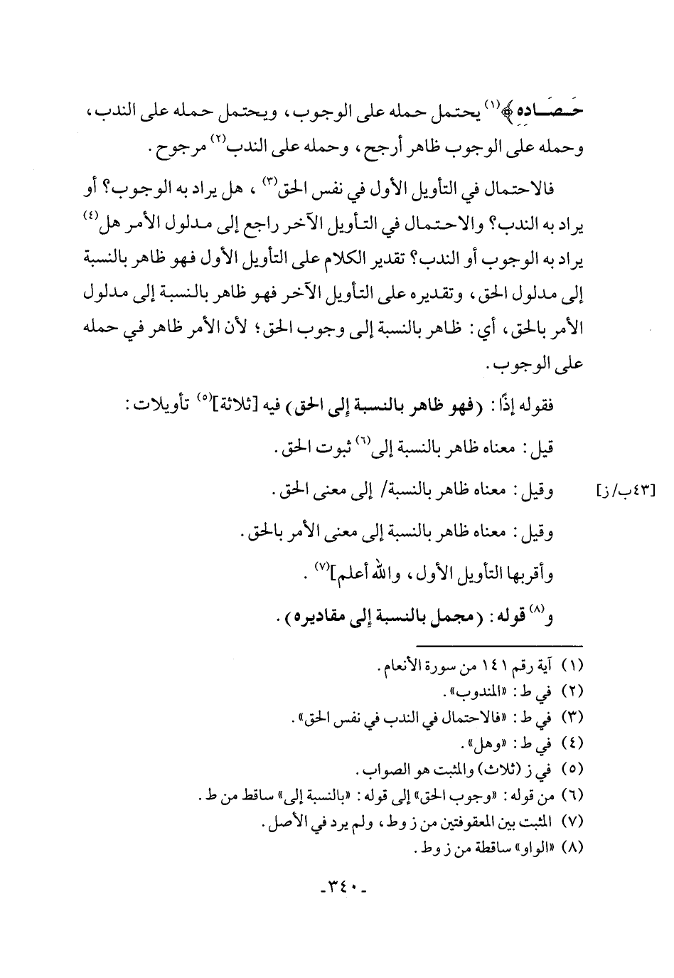 حَصَادِهِ} (¬1) يحتمل حمله على الوجوب، ويحتمل حمله على الندب، وحمله على الوجوب ظاهر أرجح، وحمله على الندب (¬2) مرجوح.
