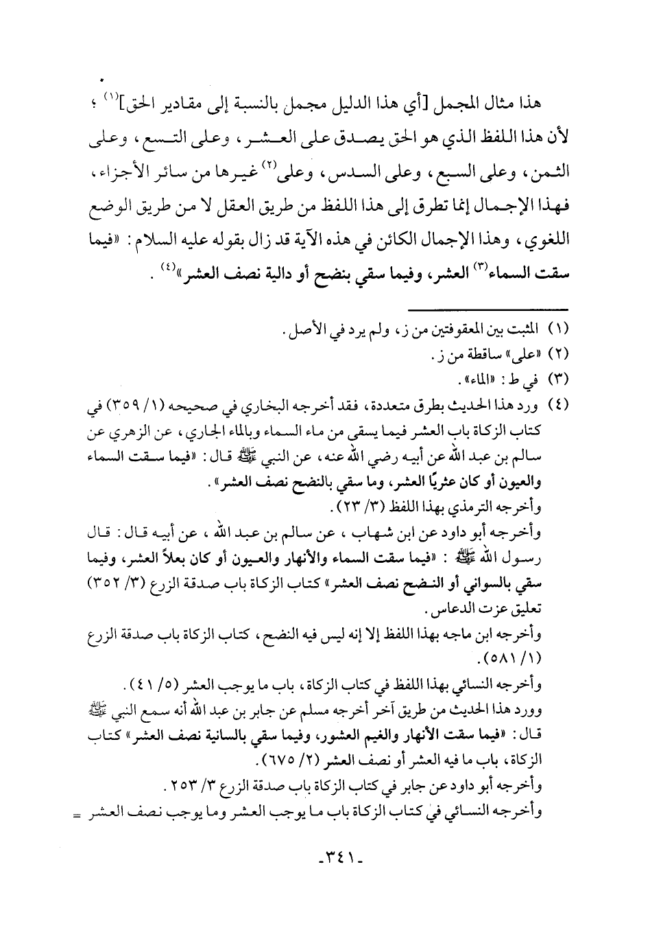 هذا مثال المجمل [أي هذا الدليل مجمل بالنسبة إلى مقادير الحق] (¬1)؛ لأن هذا اللفظ الذي هو الحق يصدق على العشر، وعلى التسع، وعلى الثمن، وعلى السبع، وعلى السدس، وعلى (¬2) غيرها من سائر الأجزاء، فهذا الإجمال إنما تطرق إلى هذا اللفظ من طريق العقل لا من طريق الوضع اللغوي، وهذا الإجمال الكائن في هذه الآية قد زال بقوله عليه السلام: "فيما سقت السماء (¬3) العشر، وفيما سقي بنضح أو دالية نصف العشر" (¬4).