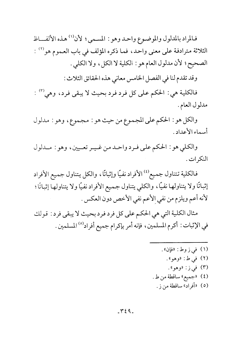 مثال الكلية التي هي الحكم على كل فرد فرد بحيث لا يبقى فرد: قولك في الإثبات: أكرم المسلمين، فإنه أمر بإكرام جميع أفراد (¬5) المسلمين.