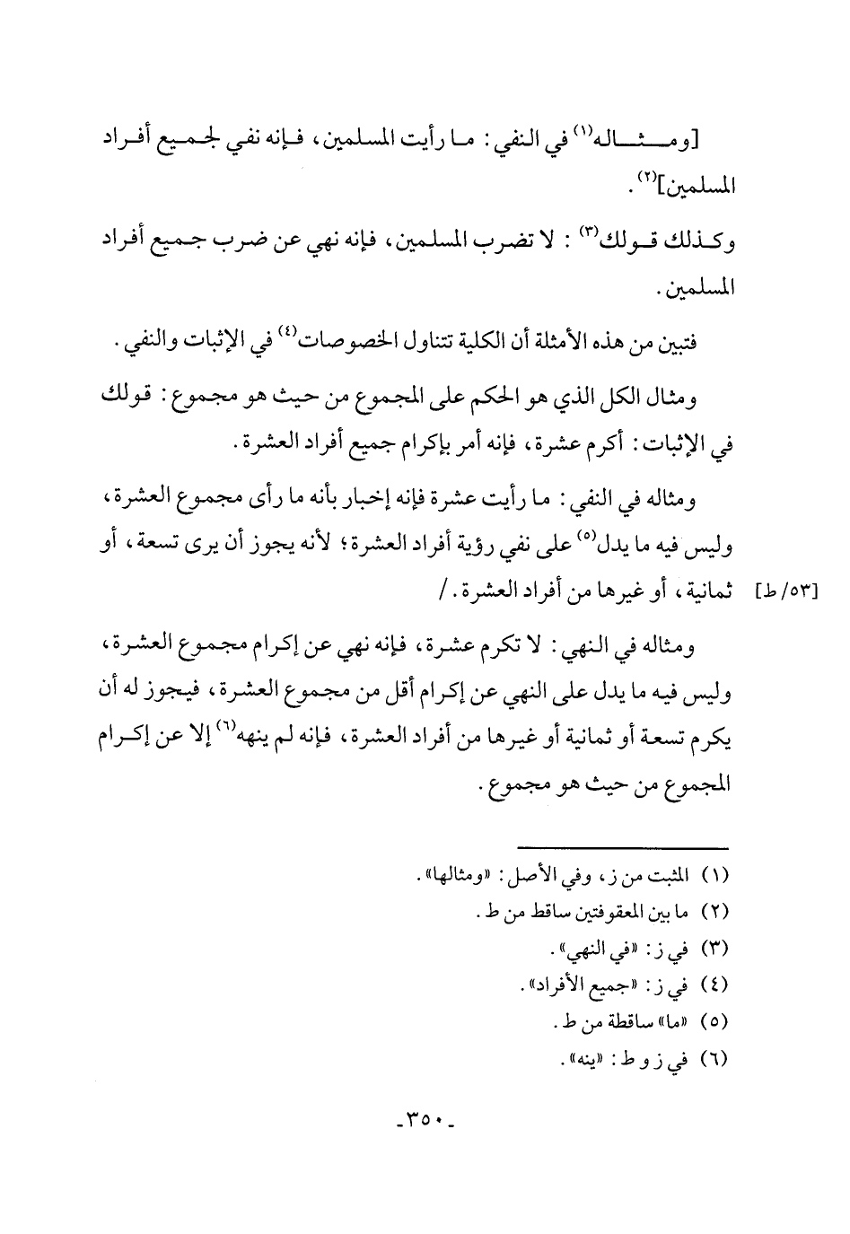 ومثال الكل الذي هو الحكم على المجموع من حيث هو مجموع: قولك في الإثبات: أكرم عشرة، فإنه أمر بإكرام جميع أفراد العشرة.