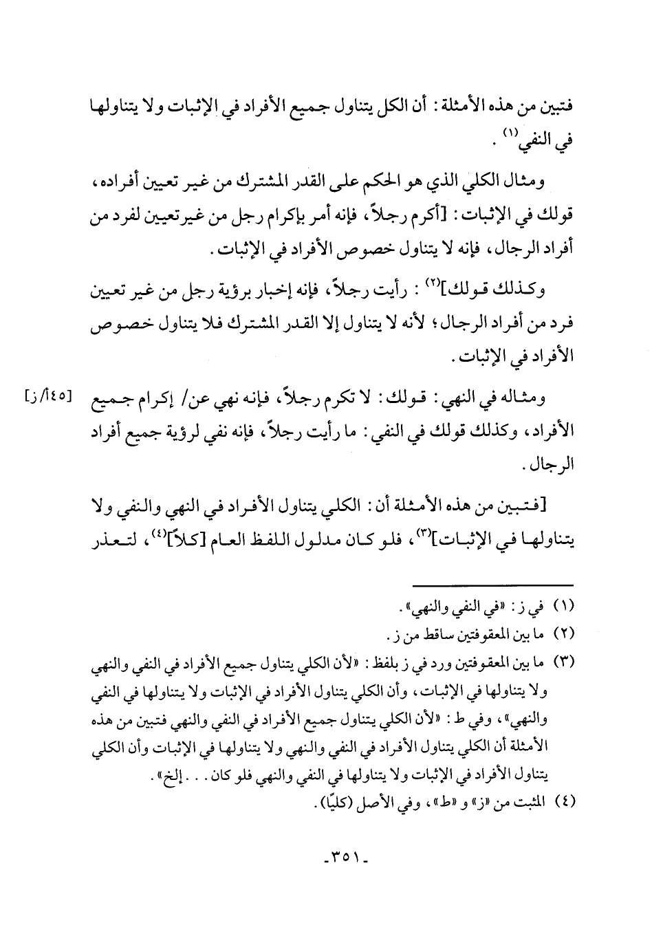 (¬3) ما بين المعقوفتين ورد في ز بلفظ: "لأن الكلي يتناول جميع الأفراد في النفي والنهي ولا يتناولها في الإثبات، وأن الكلي يتناول الأفراد في الإثبات ولا يتناولها في النفي والنهي"، وفي ط: "لأن الكلي يتناول جميع الأفراد في النفي والنهي فتبين من هذه الأمثلة أن الكلي يتناول الأفراد في النفي والنهي ولا يتناولها في الإثبات وأن الكلي يتناول الأفراد في الإثبات ولا يتناولها في النفي والنهي فلو كان ... إلخ".