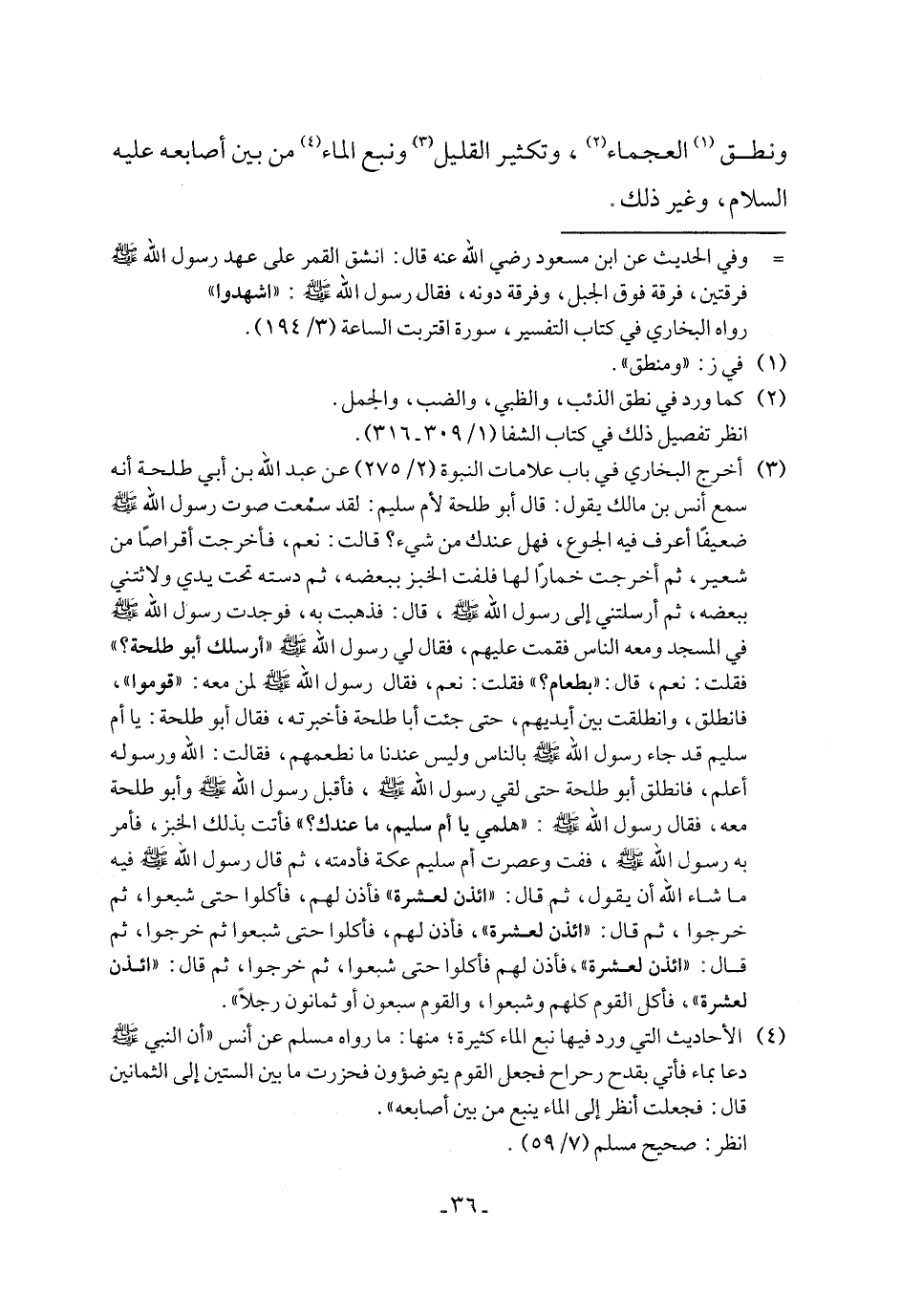(¬4) الأحاديث التي ورد فيها نبع الماء كثيرة؛ منها: ما رواه مسلم عن أنس "أن النبي - صلى الله عليه وسلم - دعا بماء فأتي بقدح رحراح فجعل القوم يتوضؤون فحزرت ما بين الستين إلى الثمانين قال: فجعلت أنظر إلى الماء ينبع من بين أصابعه".