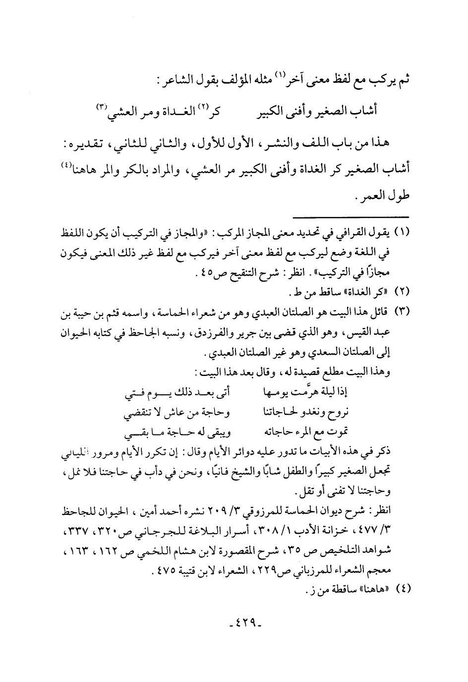 (¬1) يقول القرافي في تحديد معنى المجاز المركب: "والمجاز في التركيب أن يكون اللفظ في اللغة وضع ليركب مع لفظ معنى آخر فيركب مع لفظ غير ذلك المعنى فيكون مجازًا في التركيب". انظر: شرح التنقيح ص 45.
