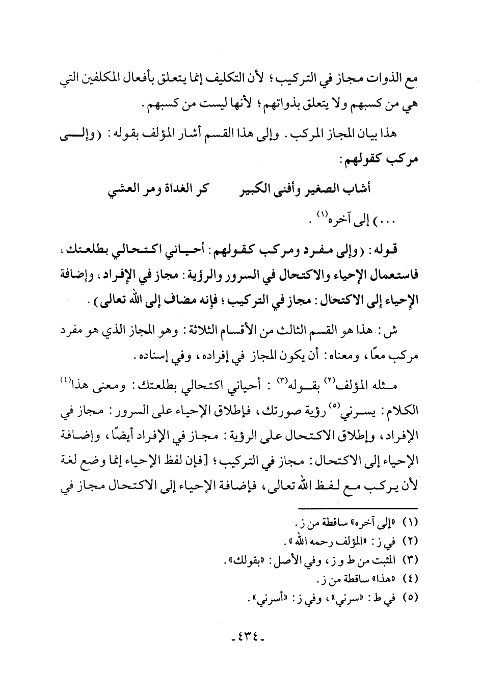 مثله المؤلف (¬2) بقوله (¬3): أحياني اكتحالي بطلعتك: ومعنى هذا (¬4) الكلام: يسرني (¬5) رؤية صورتك، فإطلاق الإحياء على السرور: مجاز في الإفراد، وإطلاق الاكتحال على الرؤية: مجاز في الإفراد أيضًا، وإضافة الإحياء إلى الاكتحال: مجاز في التركيب؛ [فإن لفظ الإحياء إنما وضع لغة لأن يركب مع لفظ الله تعالى، فإضافة الإحياء إلى الاكتحال مجاز في