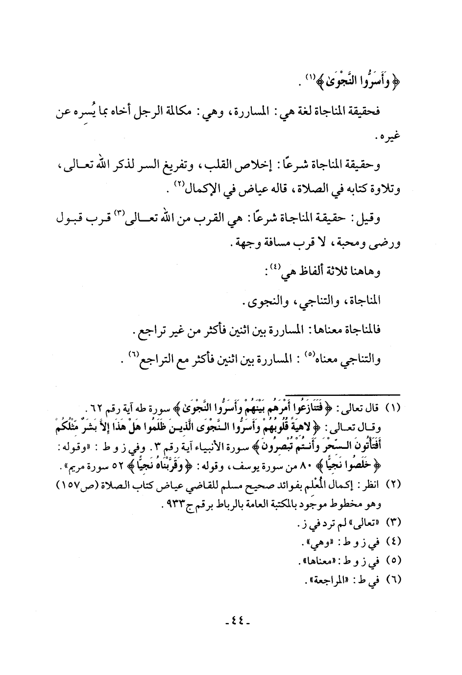 وقال تعالى: {لَاهِيَةً قُلُوبُهُمْ وَأَسَرُّوا النَّجْوَى الَّذِينَ ظَلَمُوا هَلْ هَذَا إِلَّا بَشَرٌ مِثْلُكُمْ أَفَتَأْتُونَ السِّحْرَ وَأَنْتُمْ تُبْصِرُونَ} سورة الأنبياء آية رقم 3. وفي ز وط: "وقوله: {خَلَصُوا نَجِيًّا} 80 من سورة يوسف، وقوله: {وَقَرَّبْنَاهُ نَجِيًّا} 52 سورة مريم".