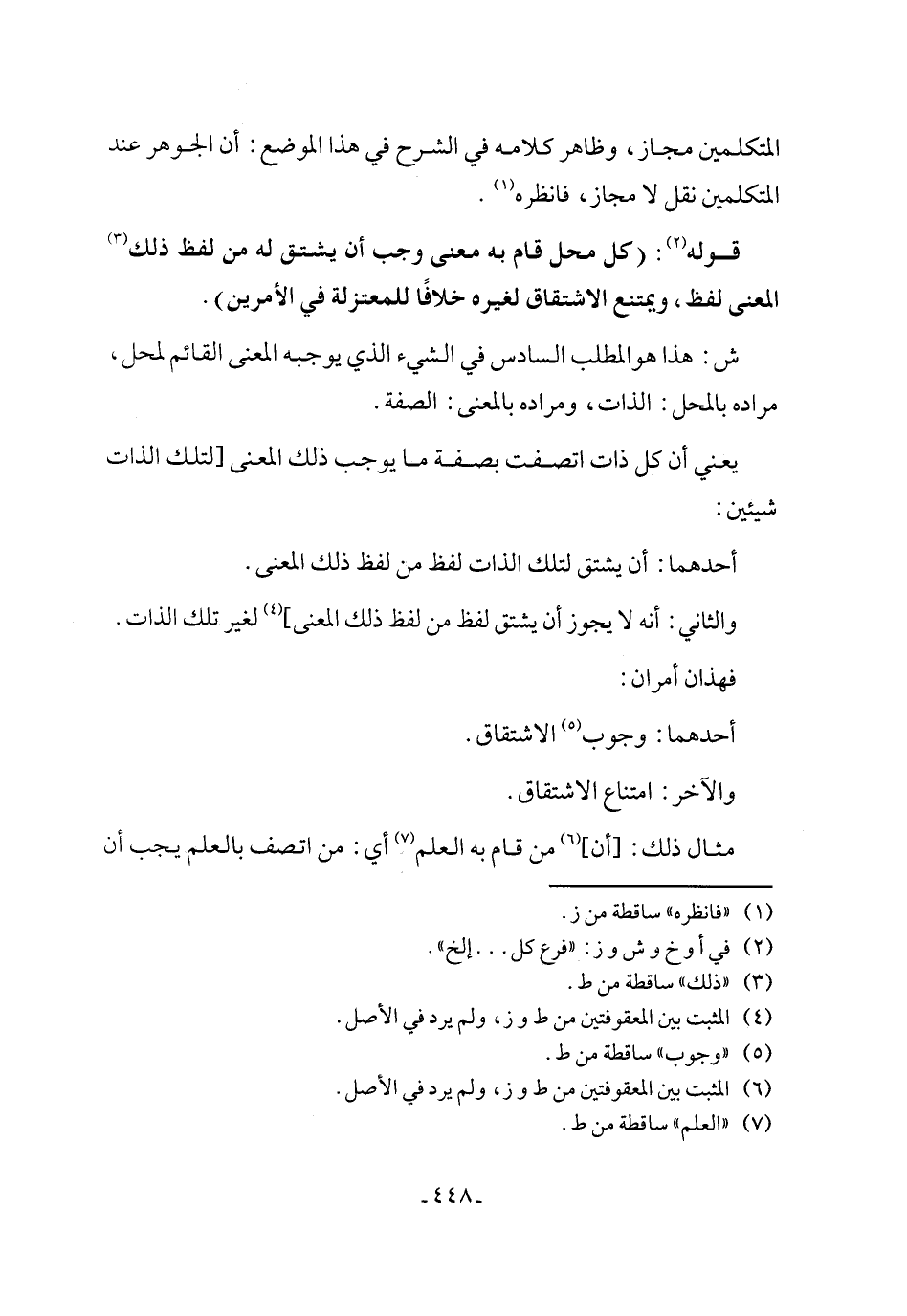 قوله (¬2): (كل محل قام به معنى وجب أن يشتق له من لفظ ذلك (¬3) المعنى لفظ، ويمتنع الاشتقاق لغيره خلافًا للمعتزلة في الأمرين).
