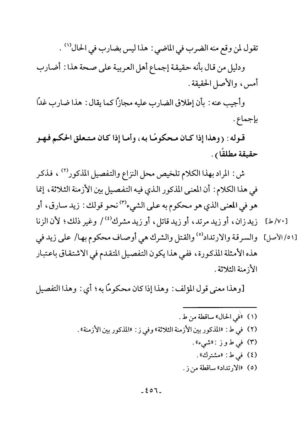 ش: المراد بهذا الكلام تلخيص محل النزاع والتفصيل المذكور (¬2)، فذكر في هذا الكلام: أن المعنى المذكور الذي فيه التفصيل بين الأزمنة الثلاثة، إنما هو في المعنى الذي هو محكوم به على الشيء (¬3) نحو قولك: زيد سارق، أو زيد زان، أو زيد مرتد، أو زيد قاتل، أو زيد مشرك (¬4) وغير ذلك؛ لأن الزنا والسرقة والارتداد (¬5) والقتل والشرك هي أوصاف محكوم بها على زيد في هذه الأمثلة المذكورة، ففي هذا يكون التفصيل المتقدم في الاشتقاق باعتبار الأزمنة الثلاثة.