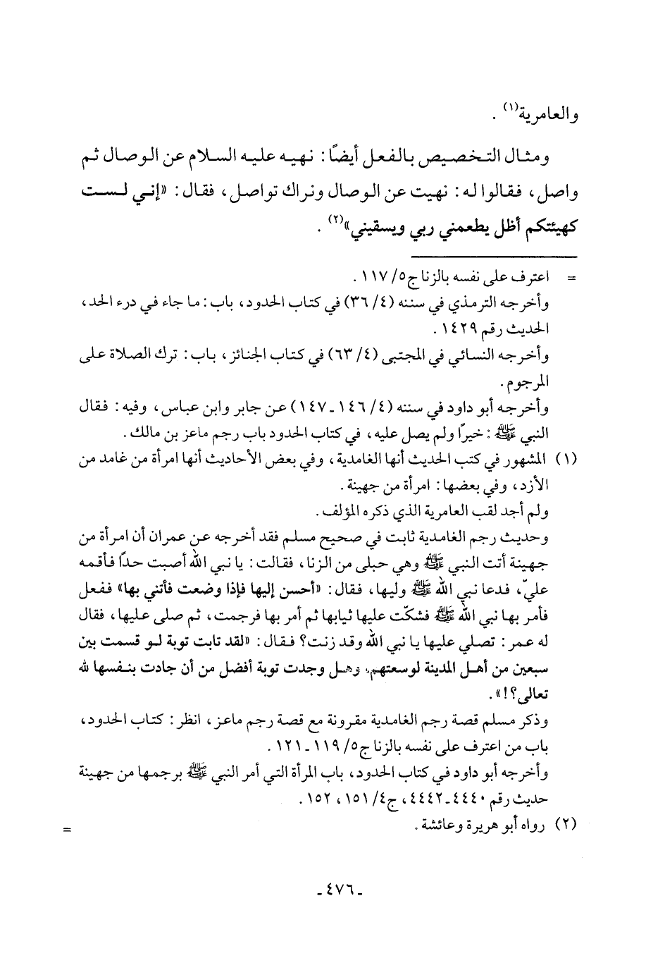 وحديث رجم الغامدية ثابت في صحيح مسلم فقد أخرجه عن عمران أن امرأة من جهينة أتت النبي - صلى الله عليه وسلم - وهي حبلى من الزنا، فقالت: يا نبي الله أصبت حدًا فأقمه عليّ، فدعا نبي الله - صلى الله عليه وسلم - وليها، فقال: "أحسن إليها فإذا وضعت فأتني بها" ففعل فأمر بها نبي الله - صلى الله عليه وسلم - فشكّت عليها ثيابها ثم أمر بها فرجمت، ثم صلّى عليها، فقال له عمر: تصلي عليها يا نبي الله وقد زنت؟ فقال: "لقد تابت توبة لو قسمت بين سبعين من أهل المدينة لوسعتهم, وهل وجدت توبة أفضل من أن جادت بنفسها لله تعالى؟! ".