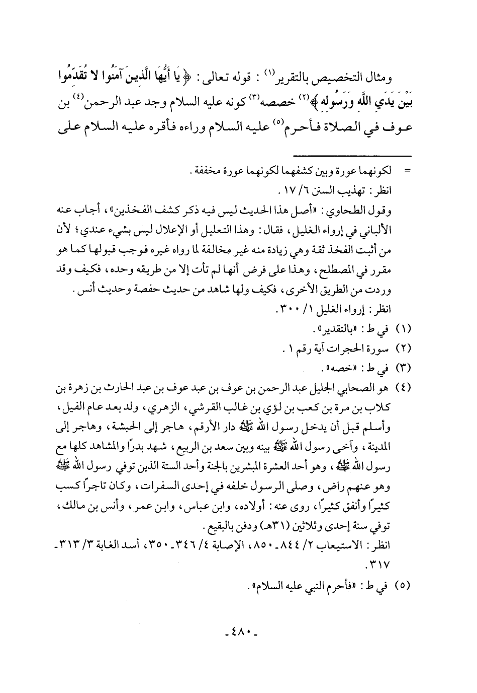 ومثال التخصيص بالتقرير (¬1): قوله تعالى: {يَاأَيُّهَا الَّذِينَ آمَنُوا لَا تُقَدِّمُوا بَيْنَ يَدَيِ اللَّهِ وَرَسُولِهِ} (¬2) خصصه (¬3) كونه عليه السلام وجد عبد الرحمن (¬4) بن عوف في الصلاة فأحرم (¬5) عليه السلام وراءه فأقره عليه السلام على