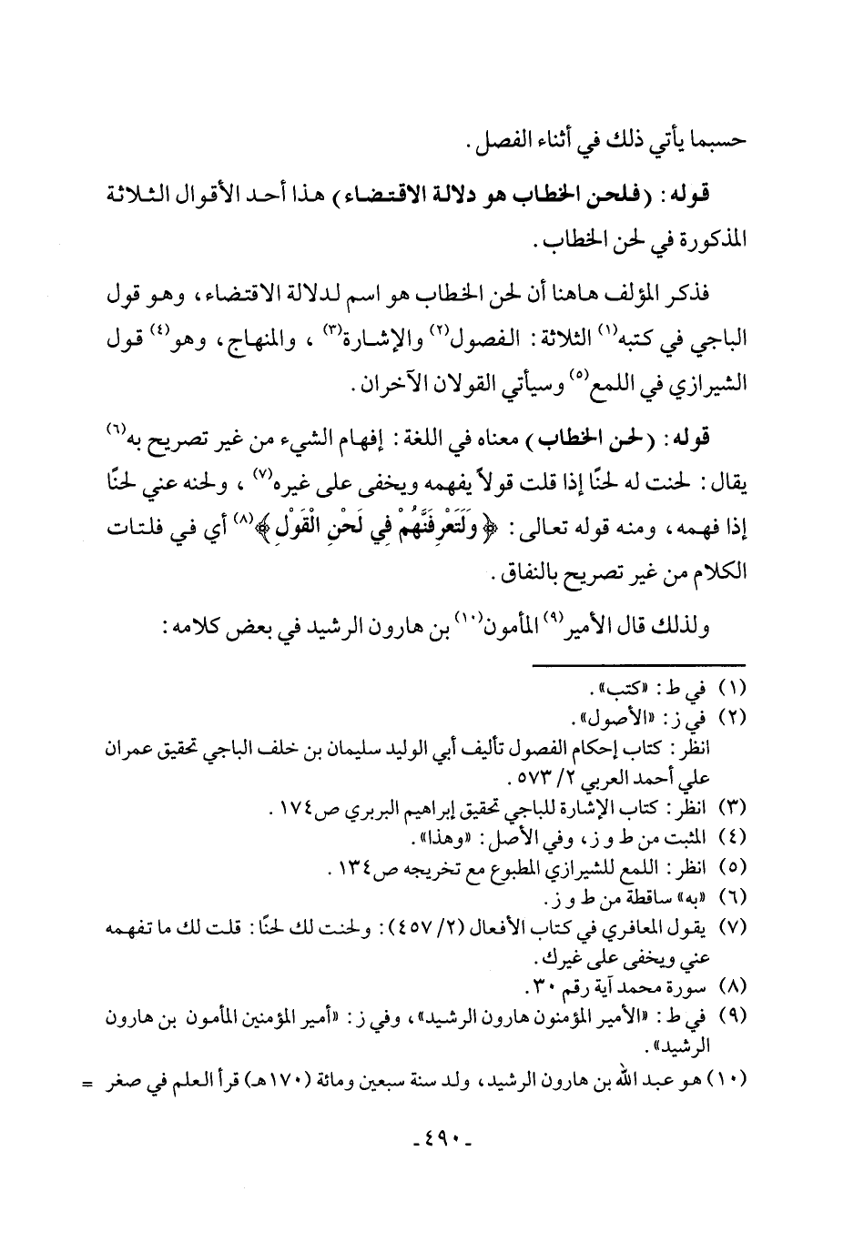 فذكر المؤلف ها هنا أن لحن الخطاب هو اسم لدلالة الاقتضاء، وهو قول الباجي في كتبه (¬1) الثلاثة: الفصول (¬2) والإشارة (¬3)، والمنهاج، وهو (¬4) قول الشيرازي في اللمع (¬5) وسيأتي القولان الآخران.