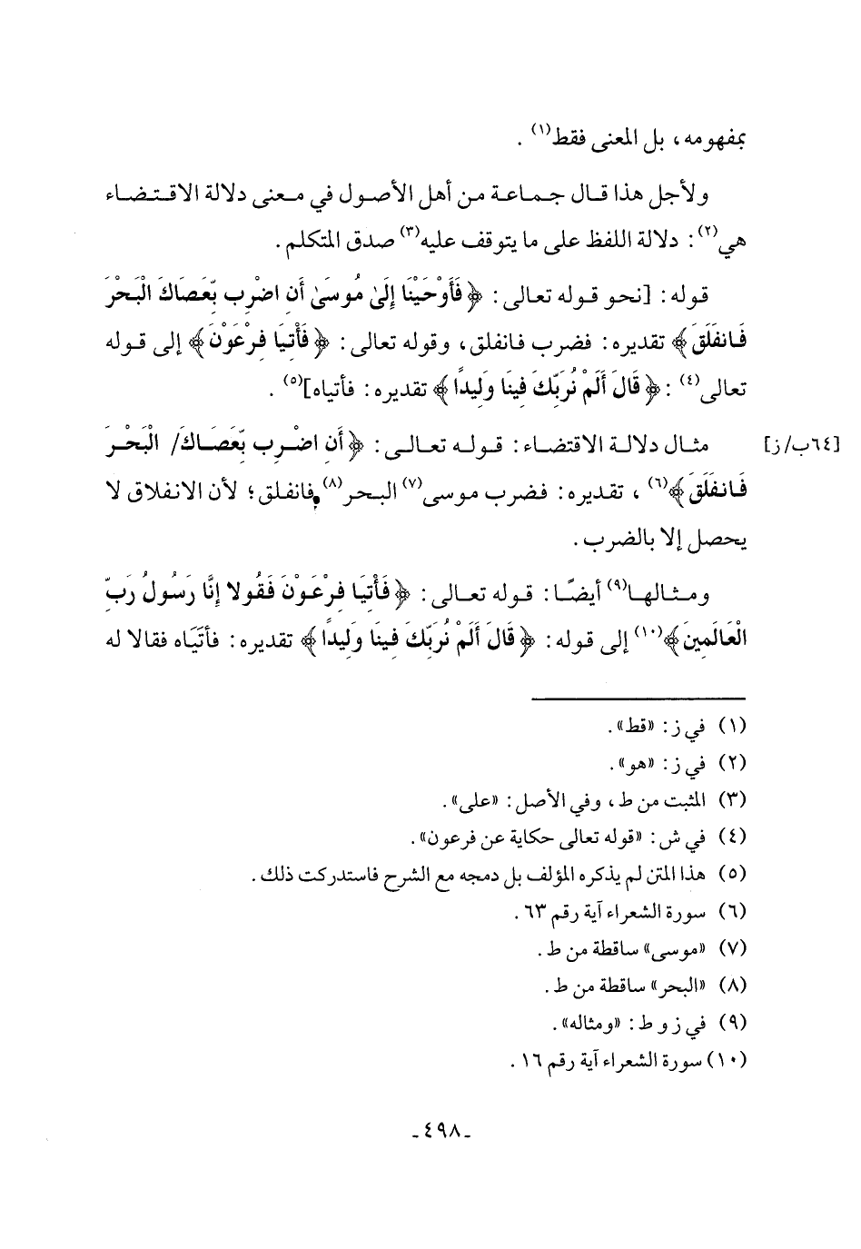 قوله: [نحو قوله تعالى: {فَأوْحَيْنَا إِلَى مُوسَى أَنِ اضْرِب بِّعَصَاكَ الْبَحْرَ فَانفَلَقَ} تقديره: فضرب فانفلق، وقوله تعالى: {فَأْتِيَا فِرْعَوْنَ} إلى قوله تعالى (¬4): {قَالَ أَلَمْ نرَبِّكَ فِينَا وَلِيدًا} تقديره: فأتياه] (¬5).