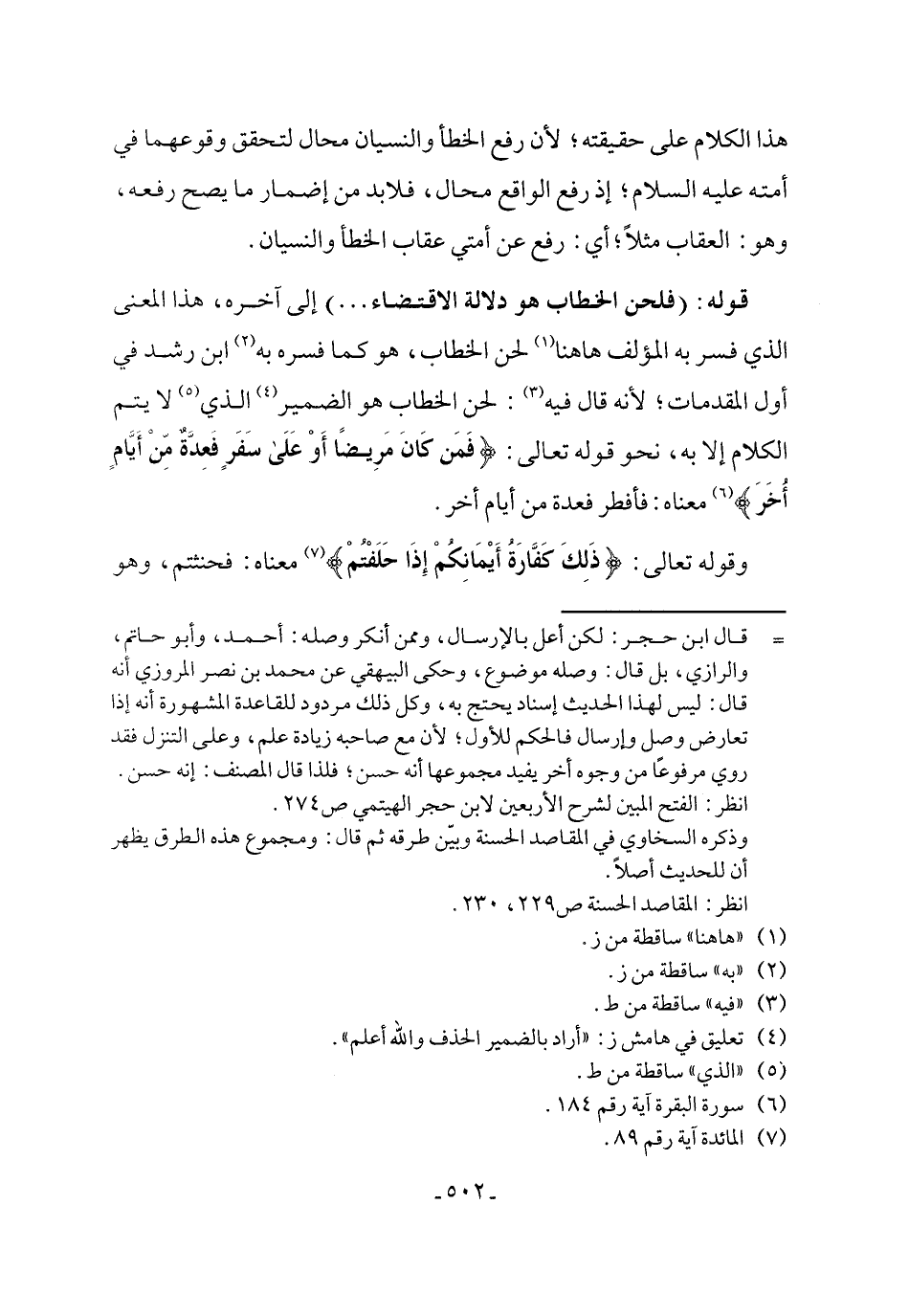 قوله: (فلحن الخطاب هو دلالة الاقتضاء ...) إلى آخره، هذا المعنى الذي فسر به المؤلف ها هنا (¬1) لحن الخطاب، هو كما فسره به (¬2) ابن رشد في أول المقدمات؛ لأنه قال فيه (¬3): لحن الخطاب هو الضمير (¬4) الذي (¬5) لا يتم الكلام إلا به، نحو قوله تعالى: {فَمَن كانَ مَرِيضًا أَوْ عَلَى سَفَرٍ فَعِدَّةٌ من أَيَّامٍ أُخَرَ} (¬6) معناه: فأفطر فعدة من أيام أخر.