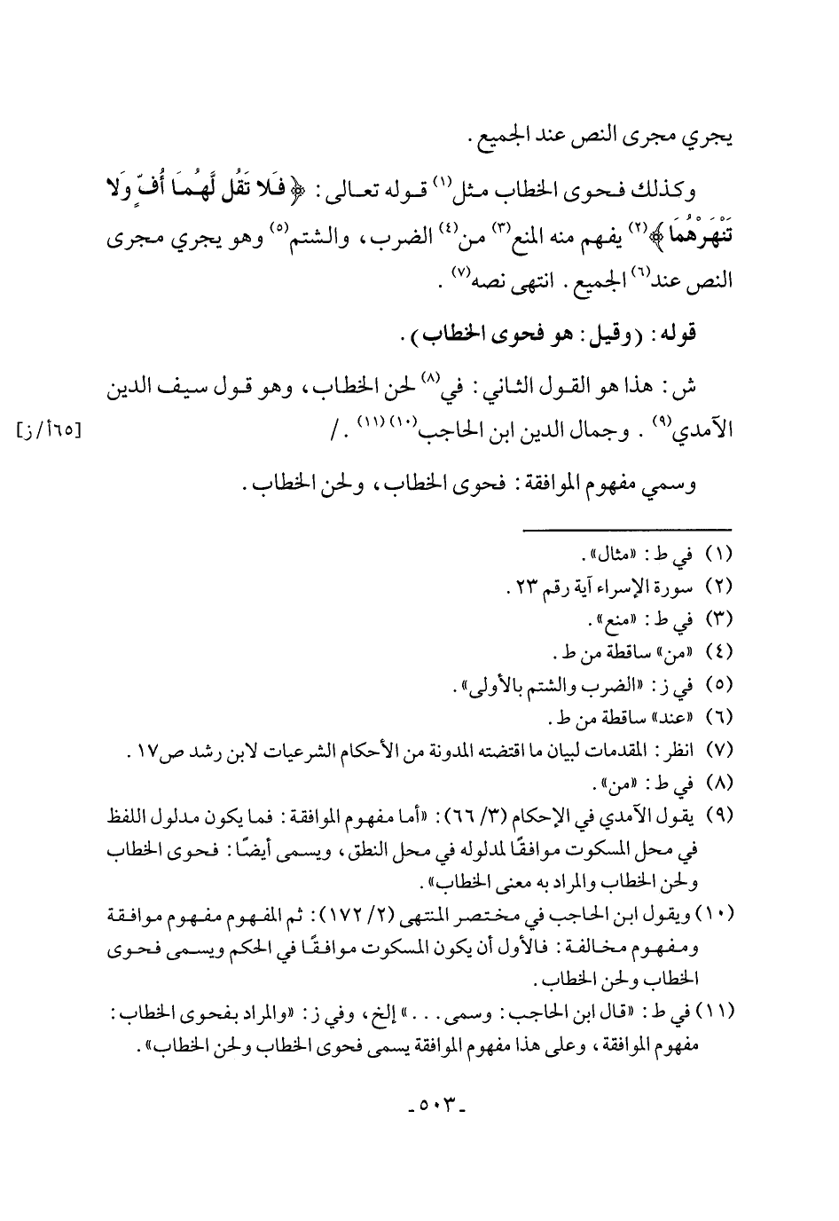 ش: هذا هو القول الثاني: في (¬8) لحن الخطاب، وهو قول سيف الدين الآمدي (¬9). وجمال الدين ابن الحاجب (¬10) (¬11).