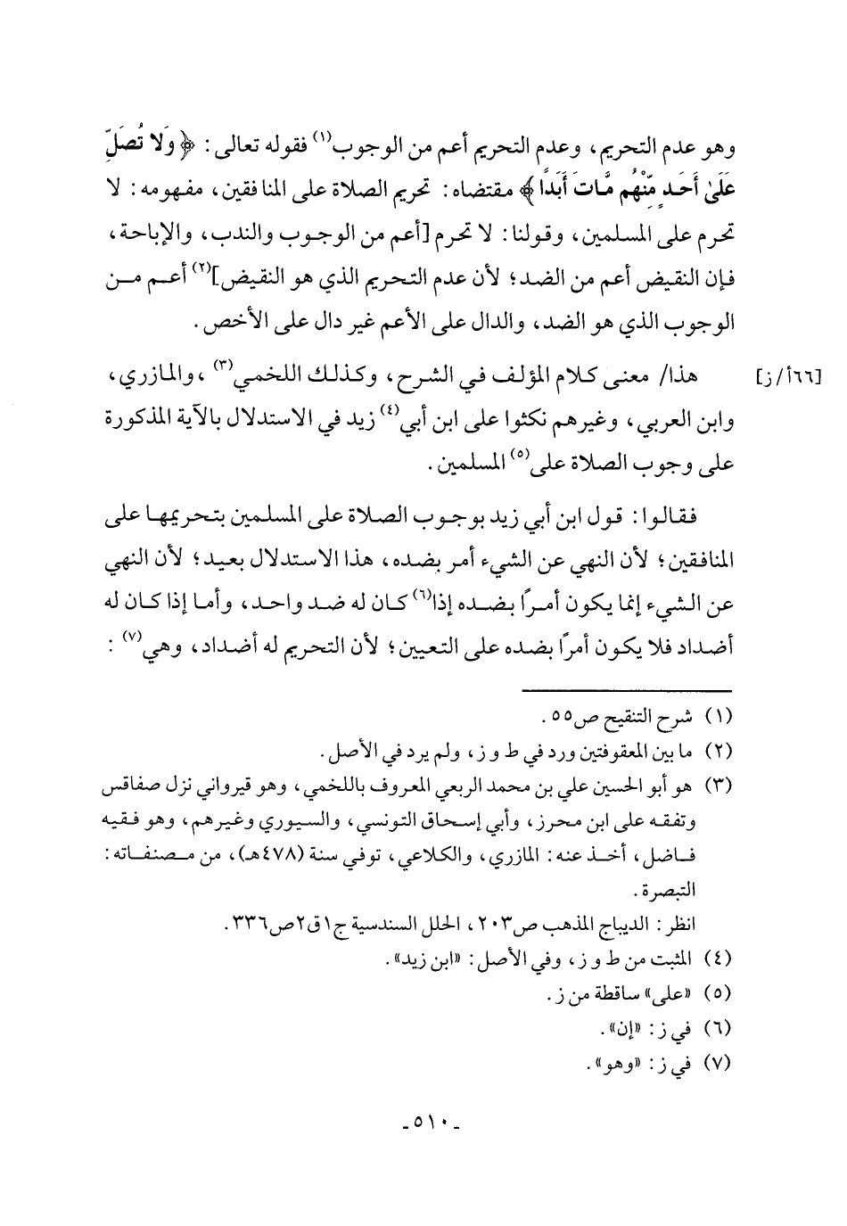 فقالوا: قول ابن أبي زيد بوجوب الصلاة على المسلمين بتحريمها على المنافقين؛ لأن النهي عن الشيء أمر بضده، هذا الاستدلال بعيد؛ لأن النهي عن الشيء إنما يكون أمرًا بضده إذا (¬6) كان له ضد واحد، وأما إذا كان له أضداد فلا يكون أمرًا بضده على التعيين؛ لأن التحريم له أضداد، وهي (¬7):