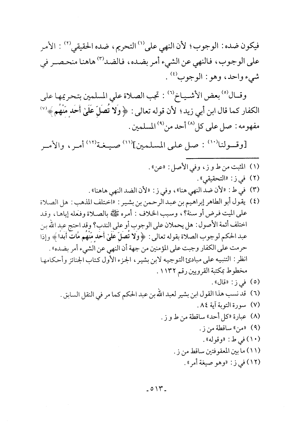 (¬4) يقول أبو الطاهر إبراهيم بن عبد الرحمن بن بشير: "اختلف المذهب: هل الصلاة على الميت فرض أو سنة؟، وسبب الخلاف: أمره - صلى الله عليه وسلم - بالصلاة وفعله إياها، وقد اختلف أئمة الأصول: هل يحملان على الوجوب أو على الندب؟ وقد احتج عبد الله بن عبد الحكم لوجوب الصلاة بقوله تعالى: {وَلَا تُصَلِّ علَى أَحَدٍ مِنْهُمْ مَاتَ أَبدًا} وإذا حرمت على الكفار وجبت على المؤمنين من جهة أن النهي عن الشيء أمر بضده".