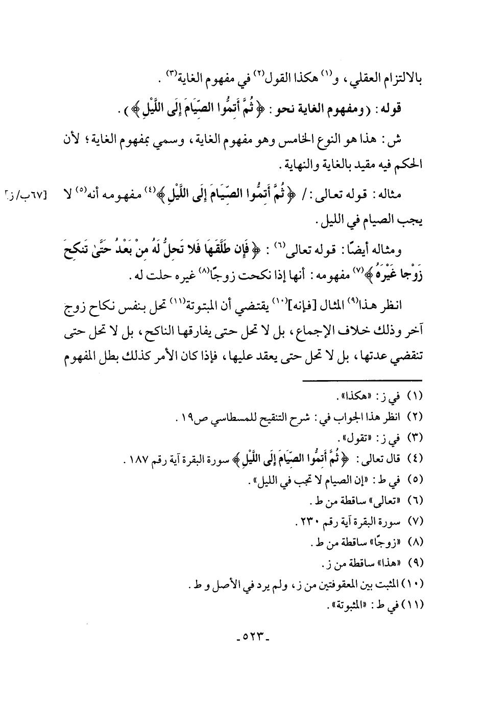 قوله: (ومفهوم الغاية نحو: {ثُمَّ أَتِمُّوا الصِّيَامَ إِلَى اللَّيْلِ}).